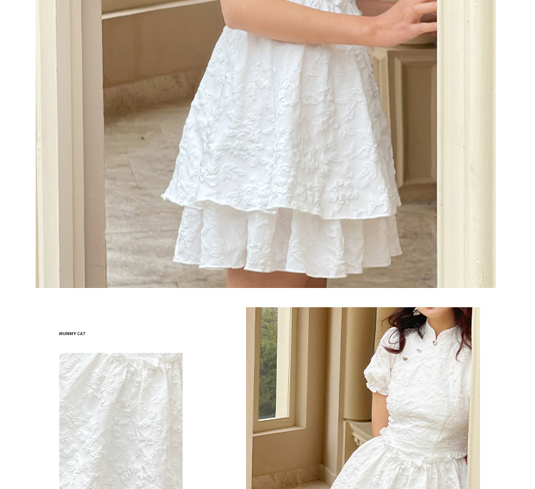下蛋喵泡泡袖娃娃領圓領甜美a字收腰褶皺顯瘦純色短款連衣裙女夏
