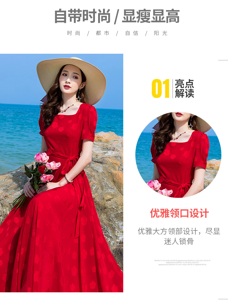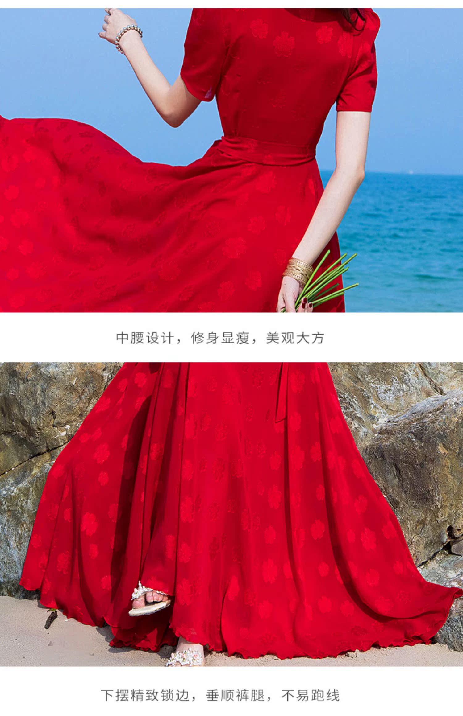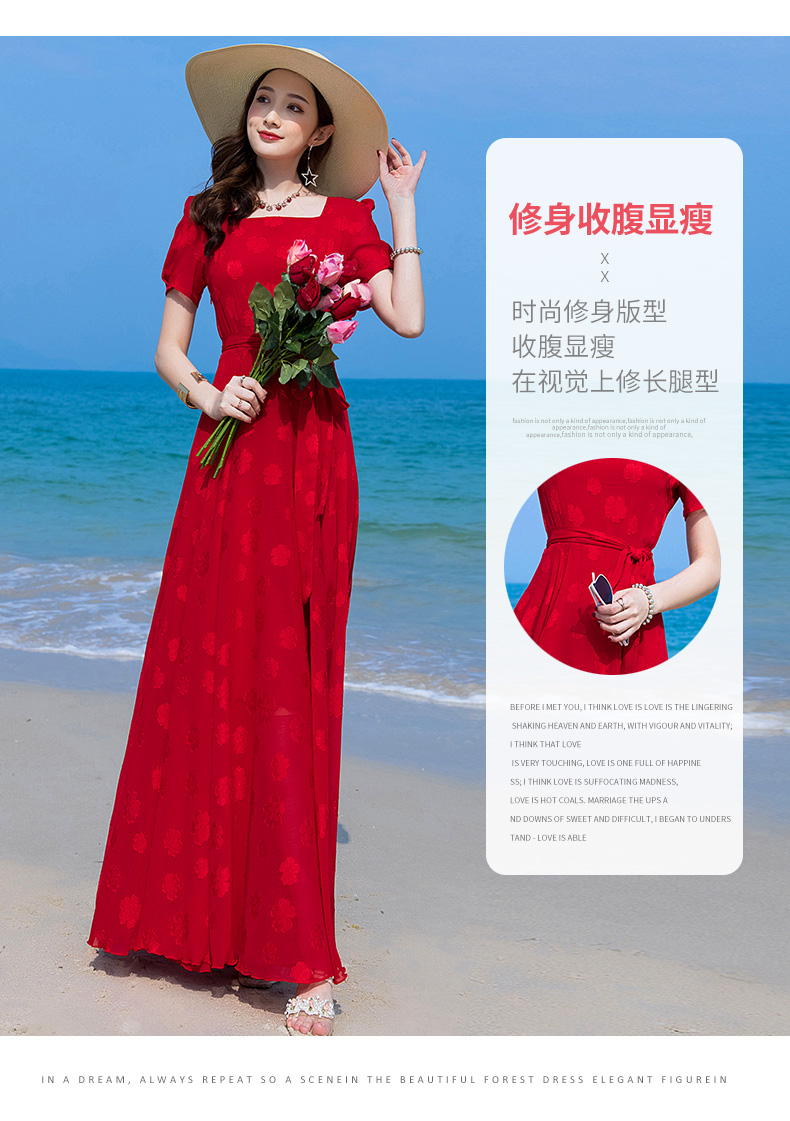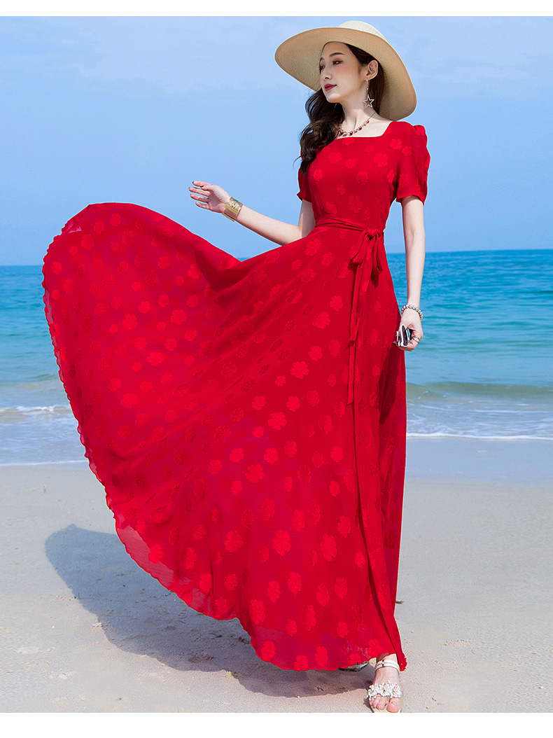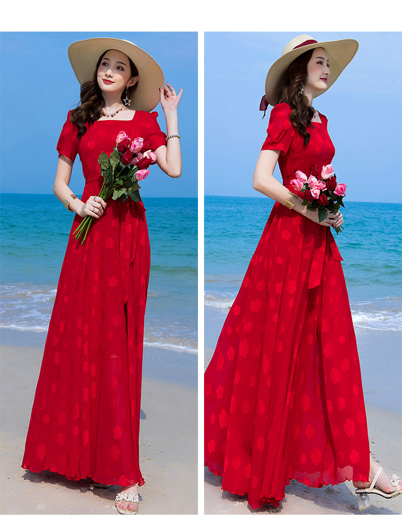 夏季紅色雪紡碎花連衣裙女長款到腳踝2023年新款超長修身方領裙子