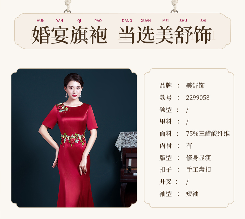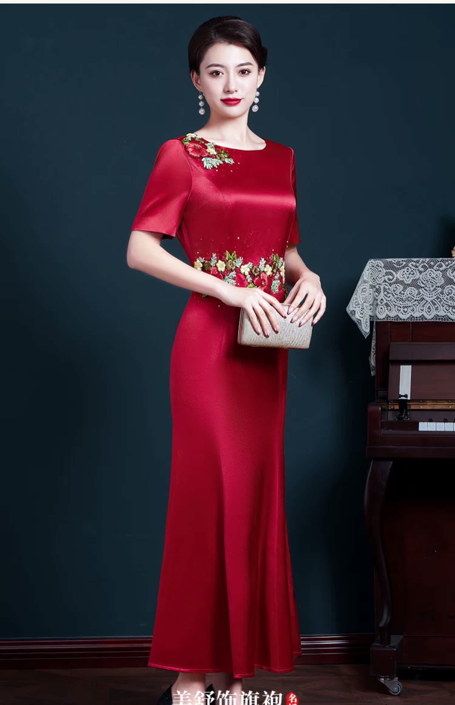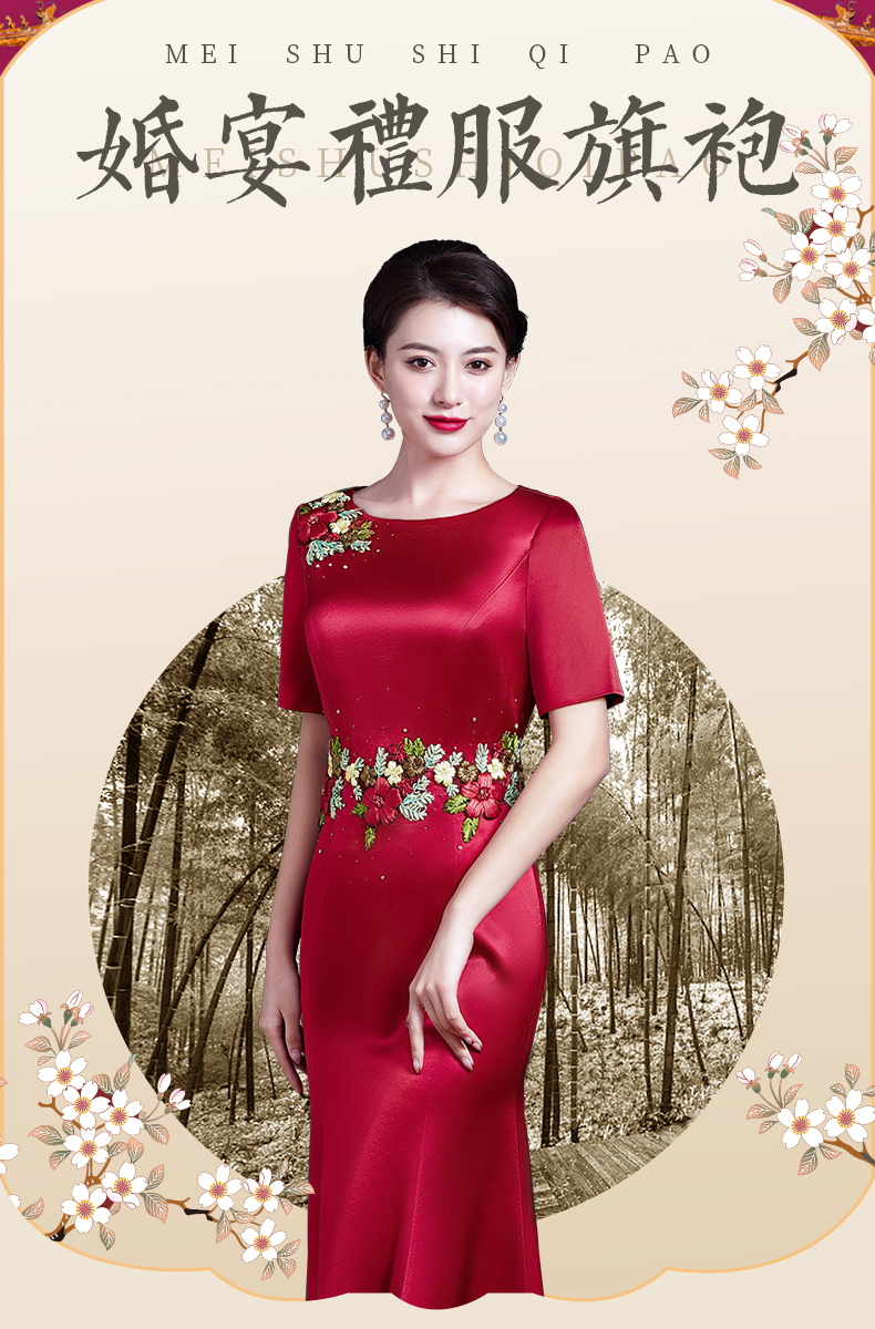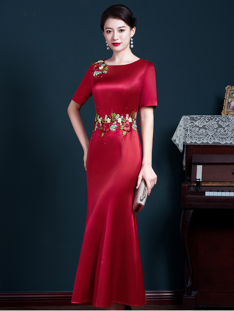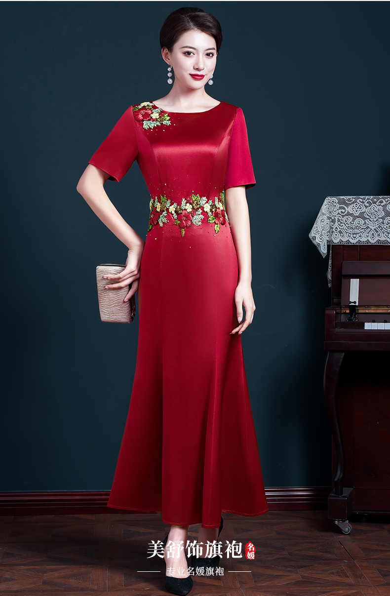 結婚媽媽裝晚禮服高貴喜婆婆旗袍婚宴醋酸刺繡紅色修身魚尾連衣裙