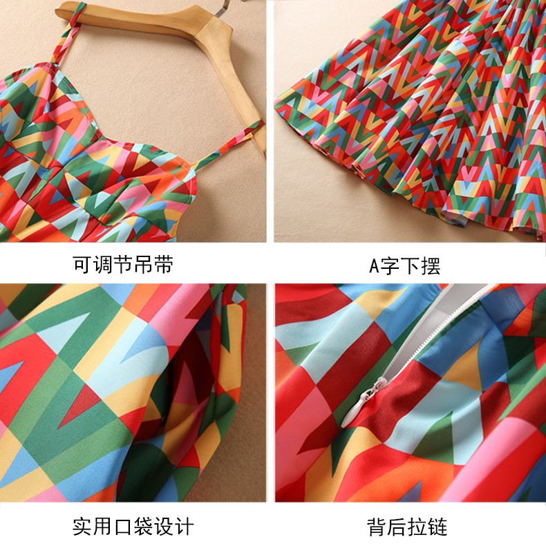 關曉彤同款度假風印花腰帶連衣裙女夏新款遮肉顯瘦中長款吊帶裙子