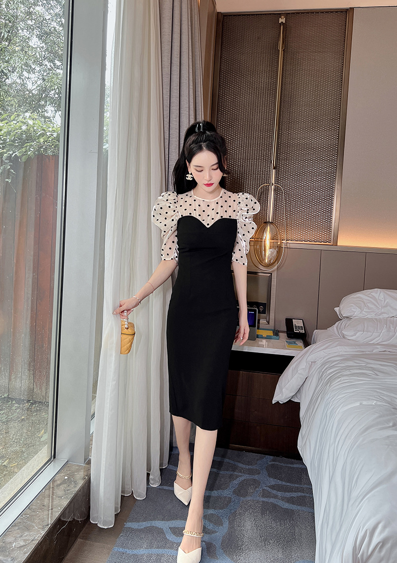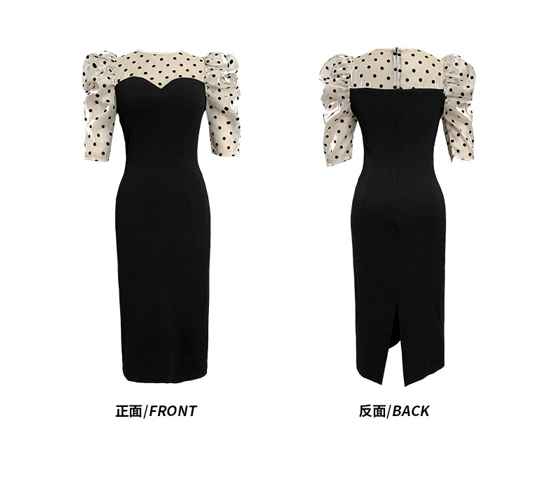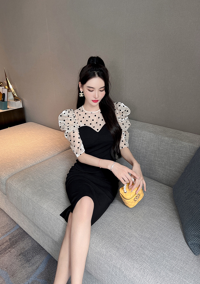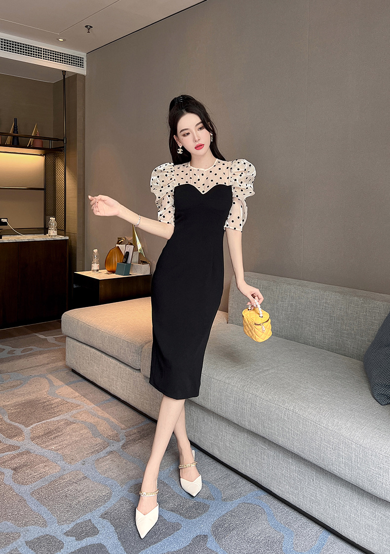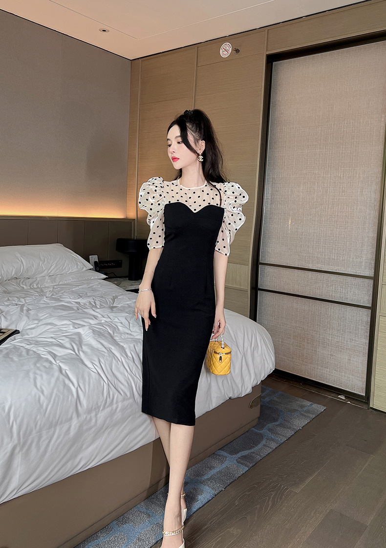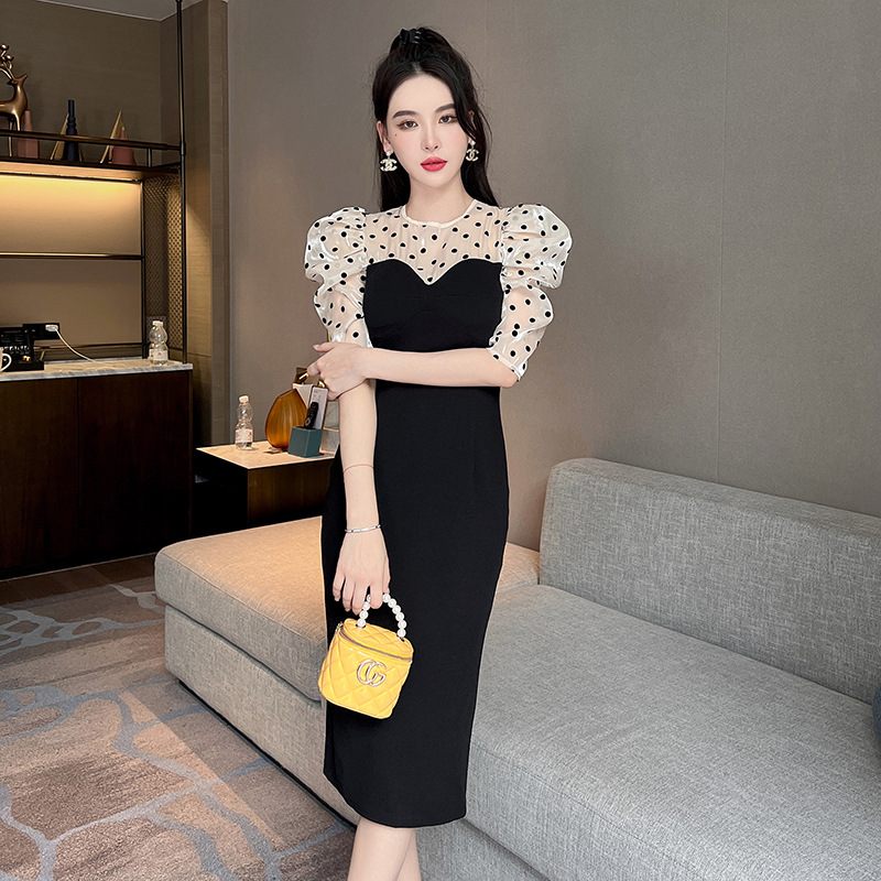 新款女裝法式名媛波點拼接泡泡袖裙子夏季性感修身包臀氣質連衣裙