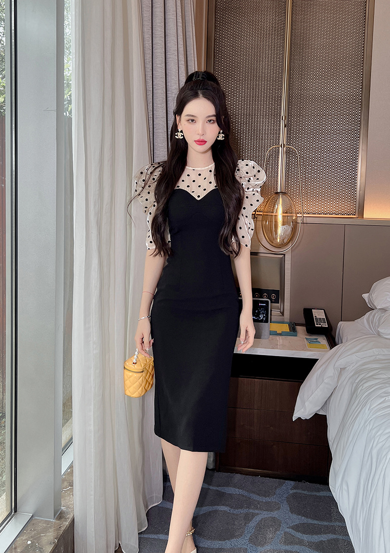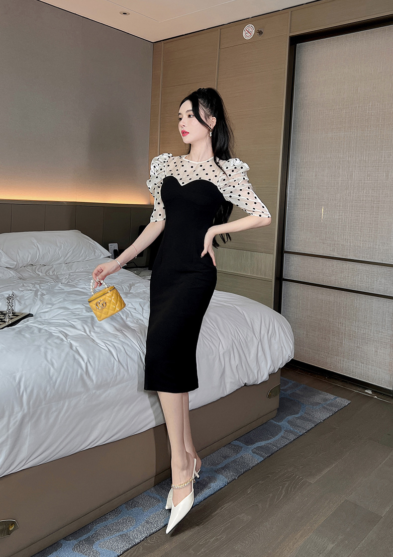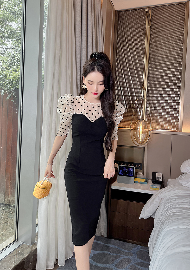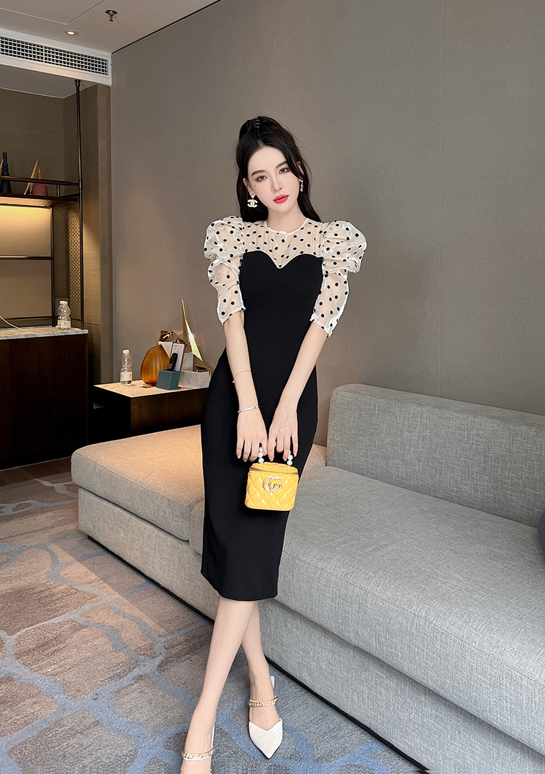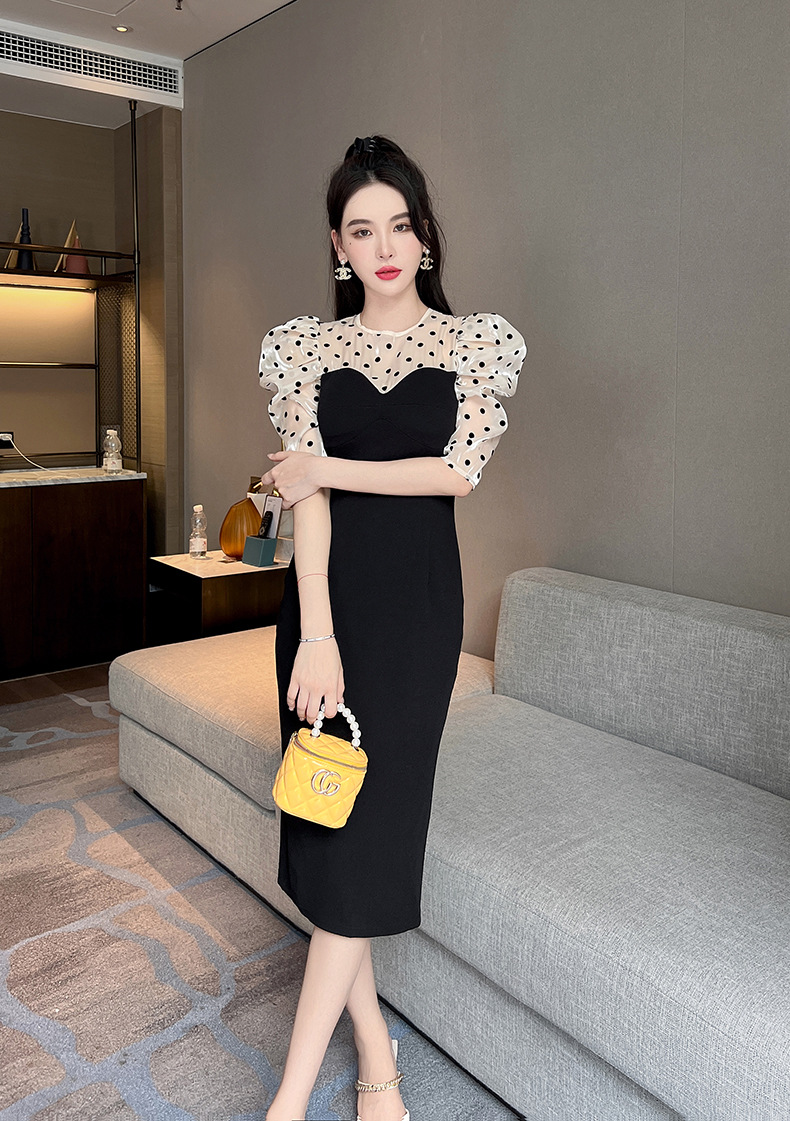 新款女裝法式名媛波點拼接泡泡袖裙子夏季性感修身包臀氣質連衣裙