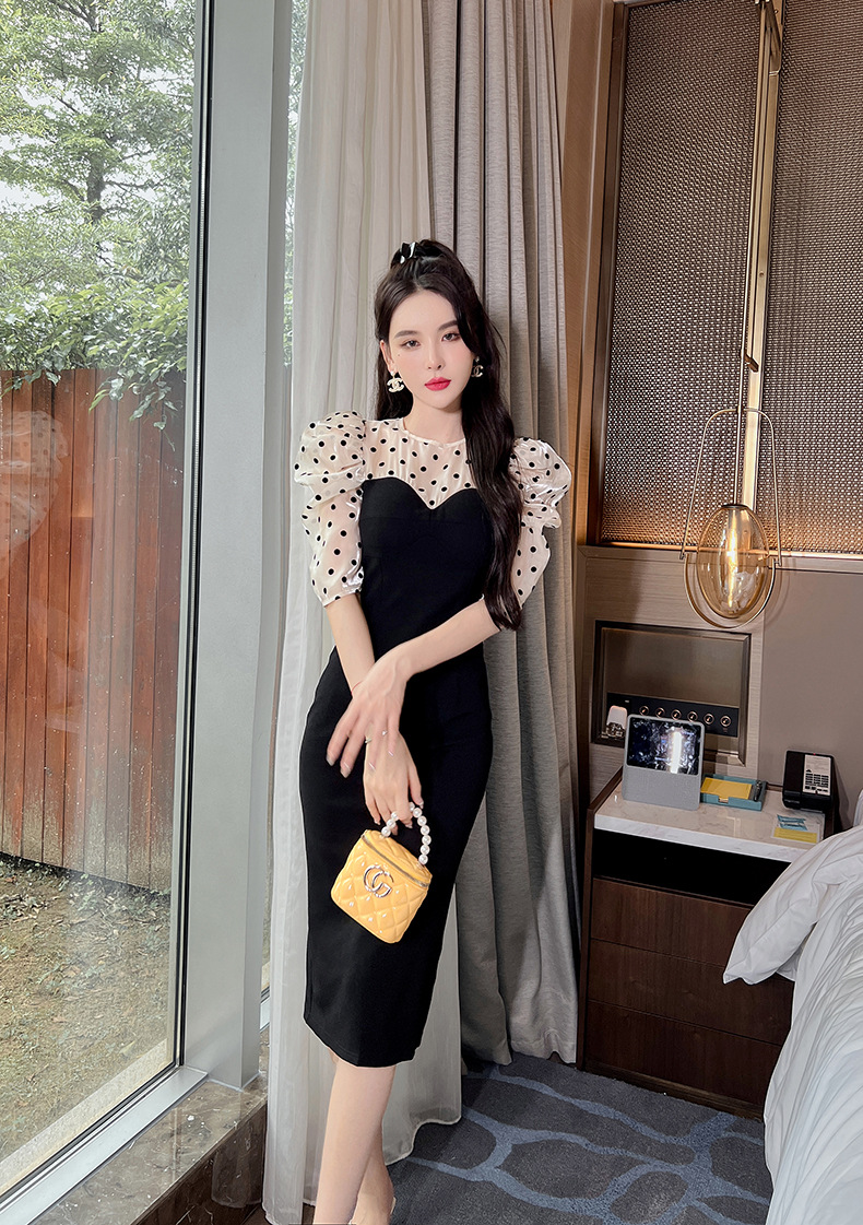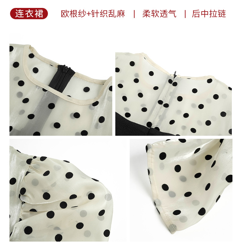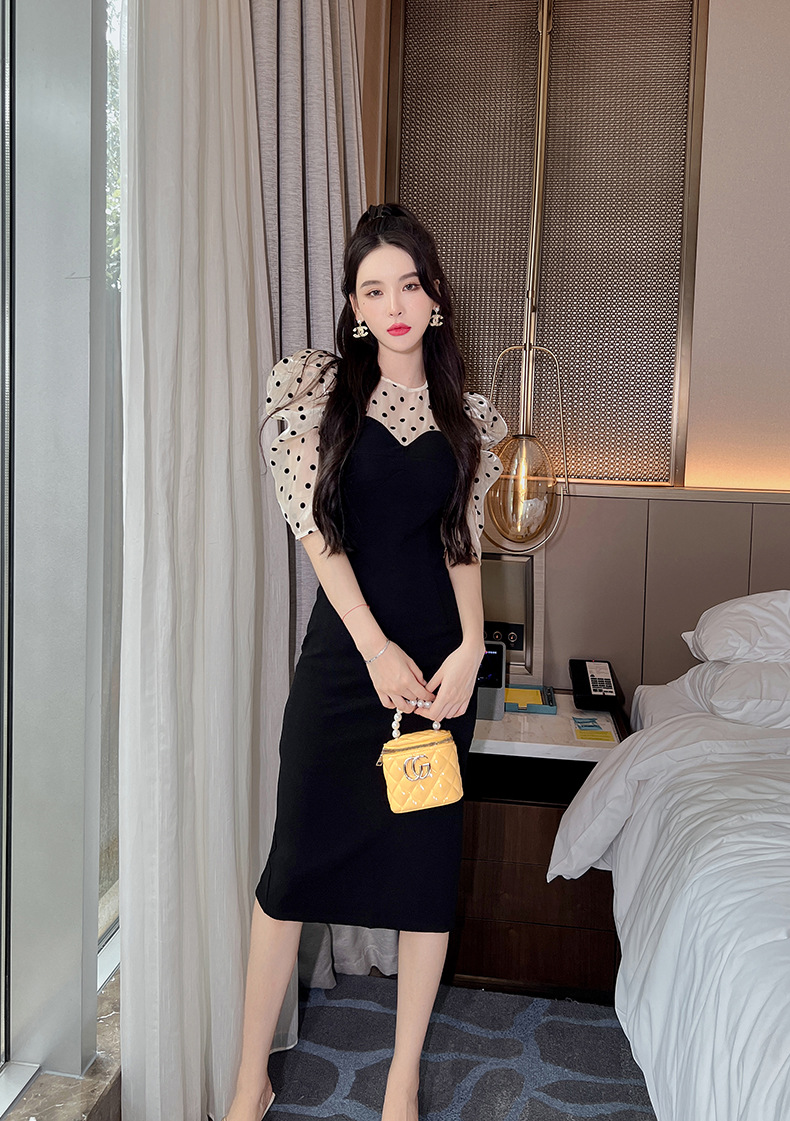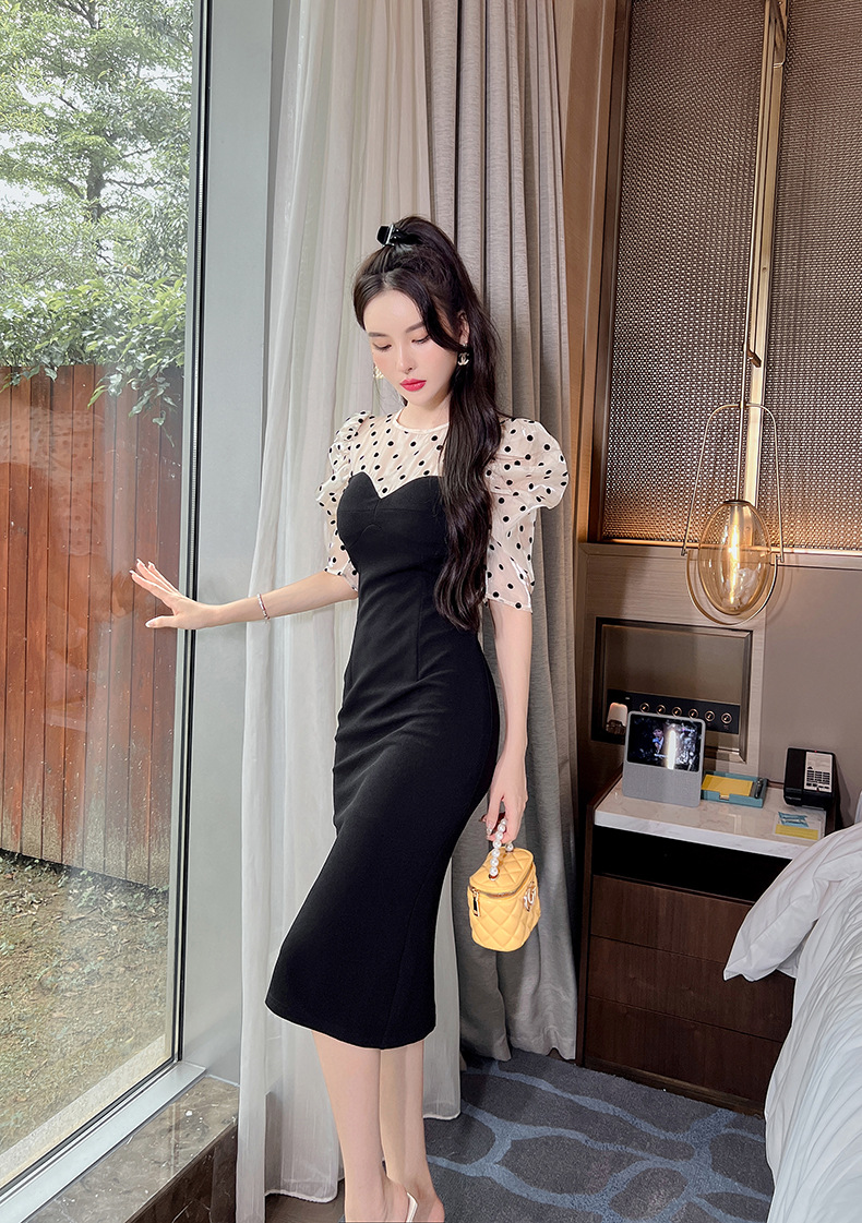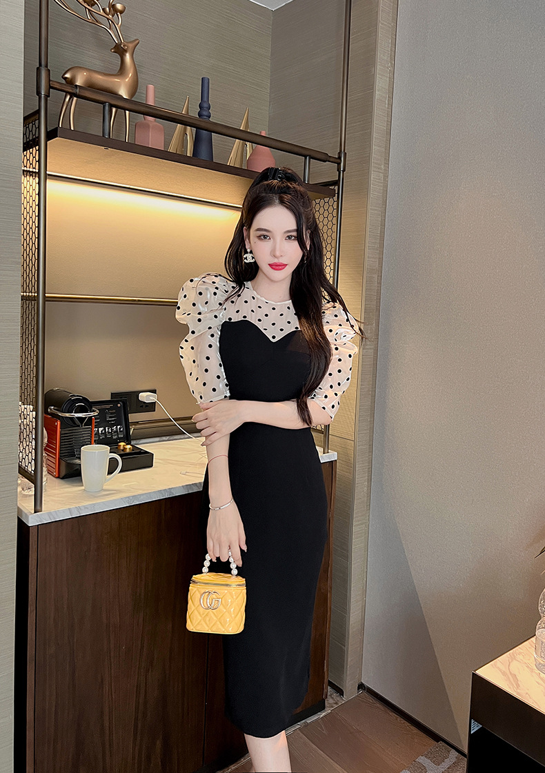 新款女裝法式名媛波點拼接泡泡袖裙子夏季性感修身包臀氣質連衣裙