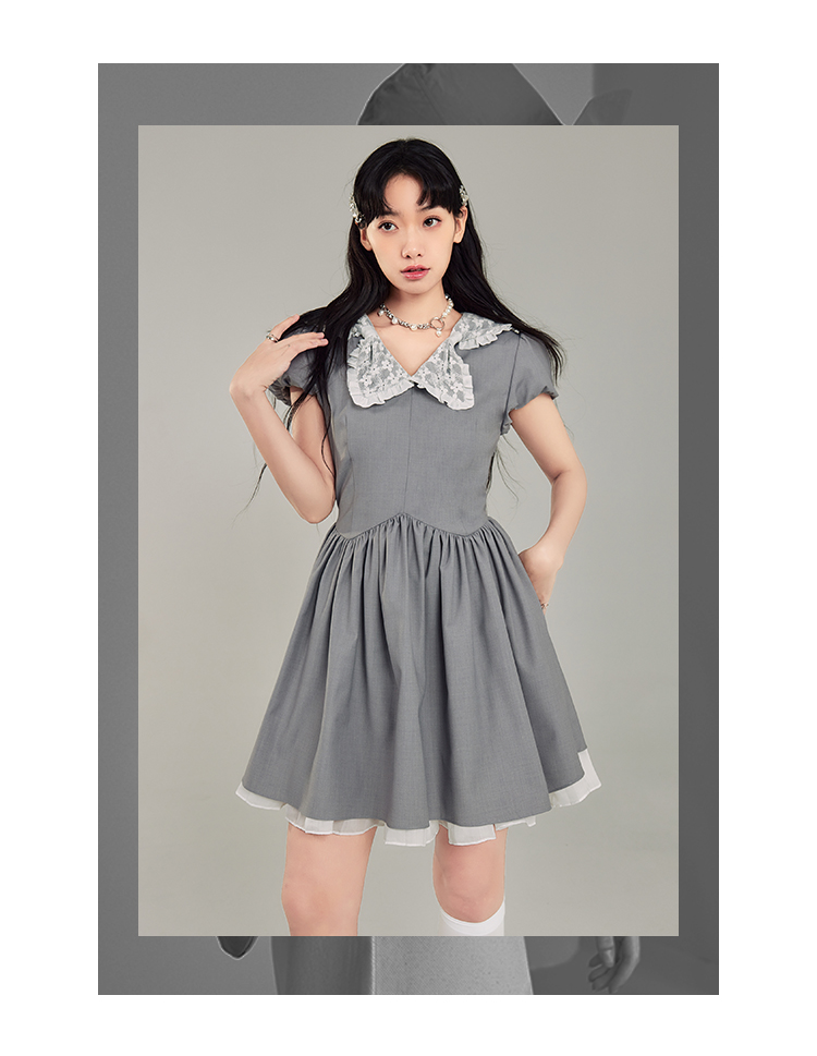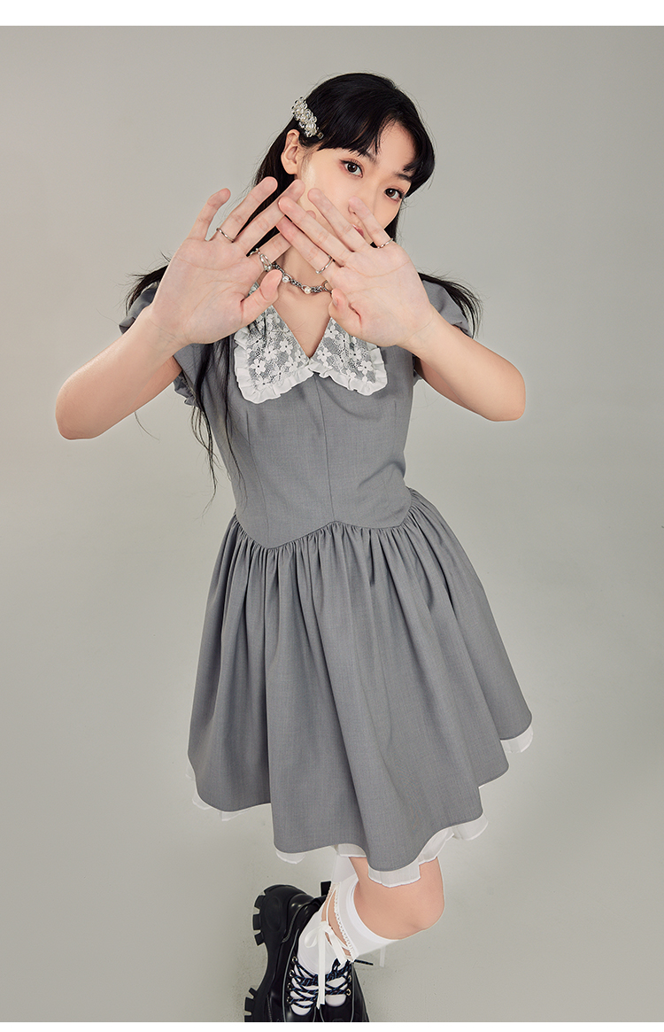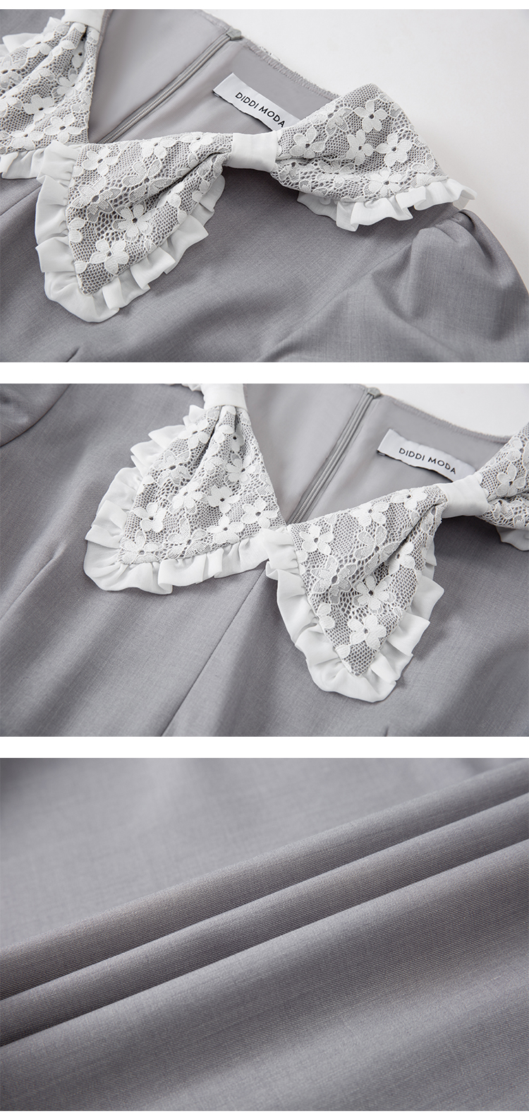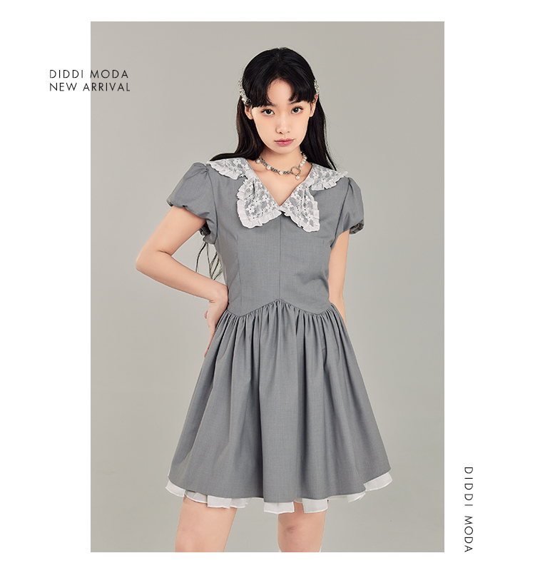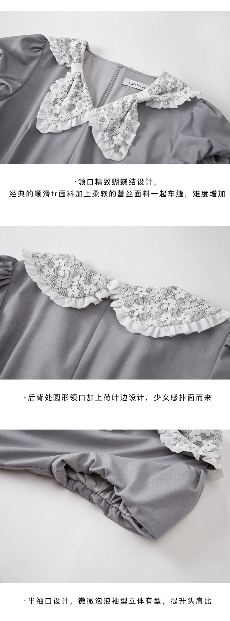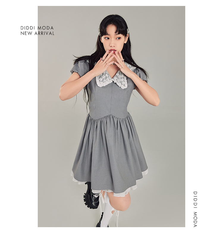 DIDDI 原創設計 甜心辣妹-蝴蝶結娃娃領灰色短裙女收腰顯瘦連衣裙