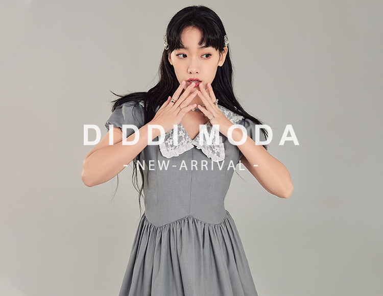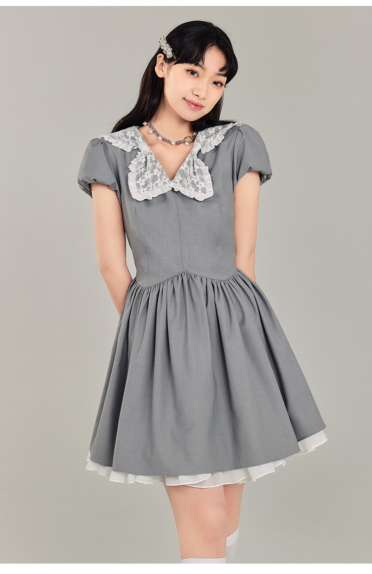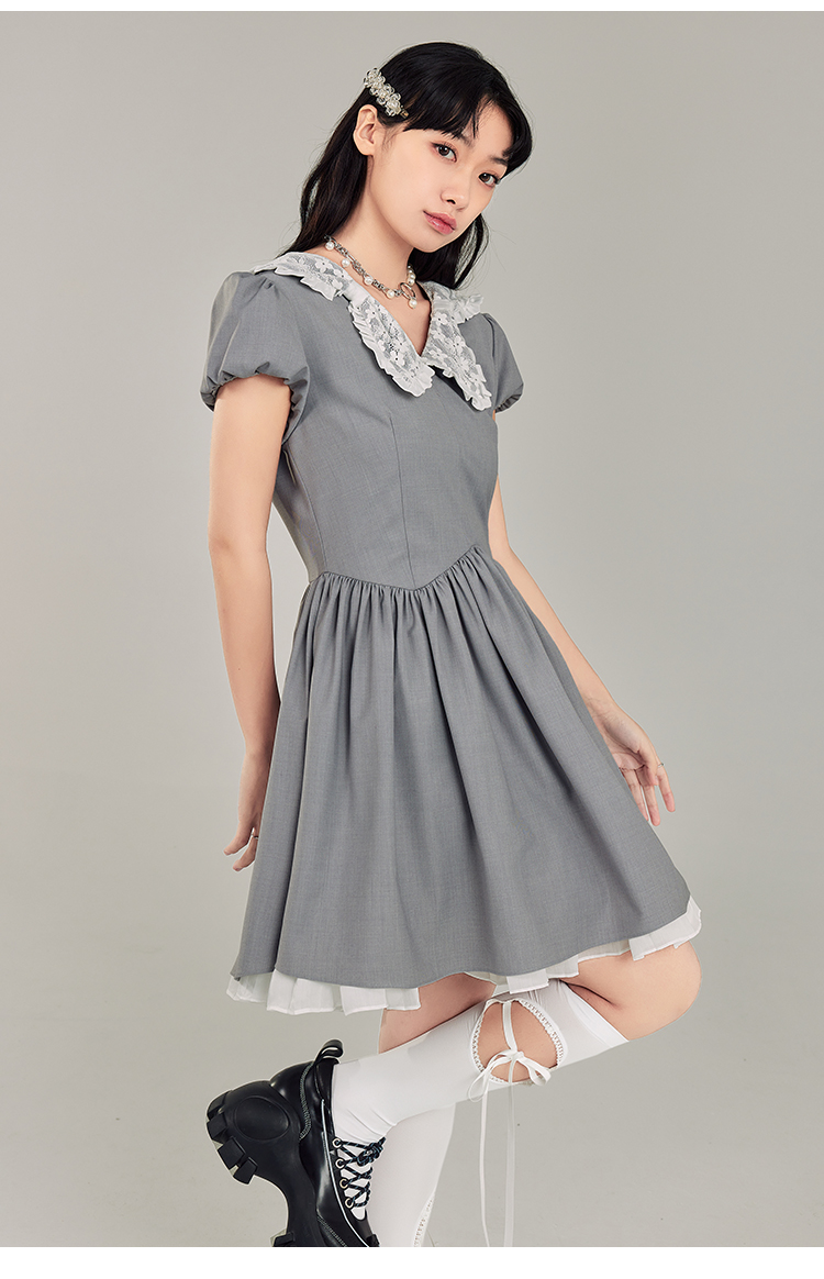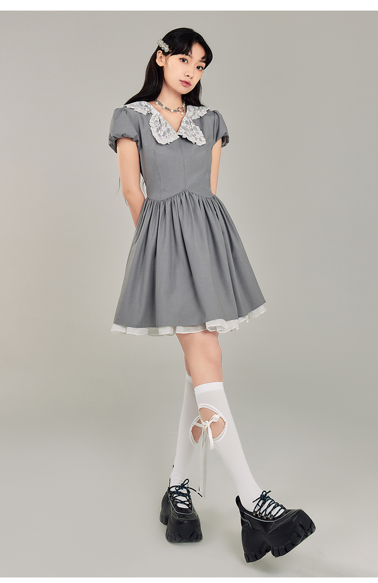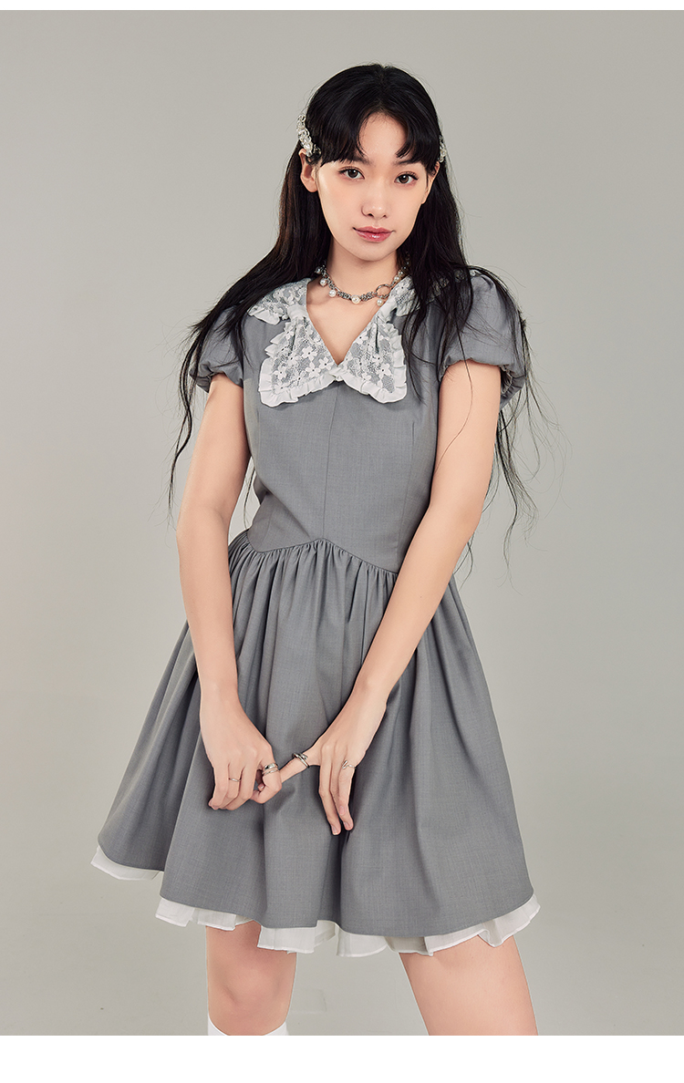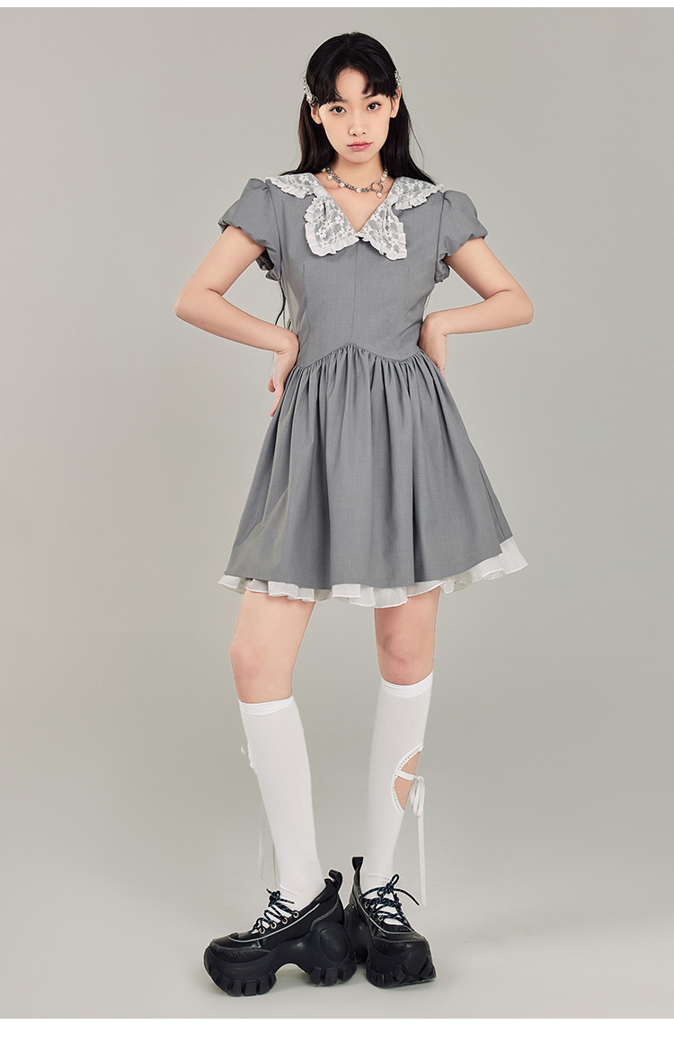 DIDDI 原創設計 甜心辣妹-蝴蝶結娃娃領灰色短裙女收腰顯瘦連衣裙