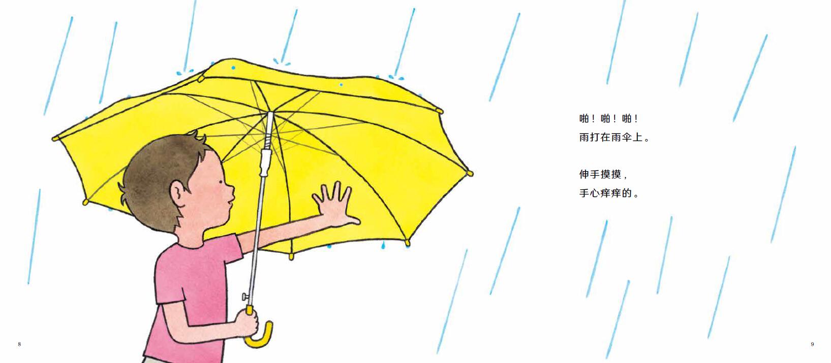 下雨天,我使勁一按雨傘,雨傘打開了!我打著傘在雨中玩耍,雨打在雨傘上。伸手摸摸,手心癢癢的。大風把傘吹得要到處跑。好朋友打著一把藍雨傘,她好像在藍天里。連起來,幾把小雨傘還可以變成大雨傘,傘下的世界真有趣。