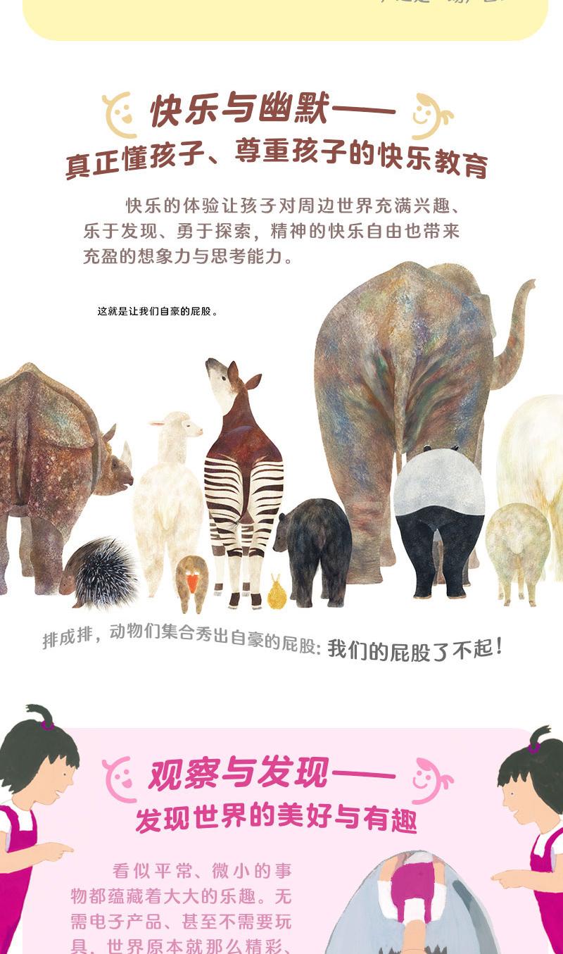 動物們集體秀出它們自豪的屁股。老虎、斑馬的屁股是條紋的,長頸鹿的屁股上有花紋,小鹿的屁股是心形的。綿羊的屁股暄騰騰,犀牛的屁股硬邦邦,刺猬的屁股全是刺,看著好厲害。都是自豪的屁股!動物們仿佛在說:我們的屁股了不起!