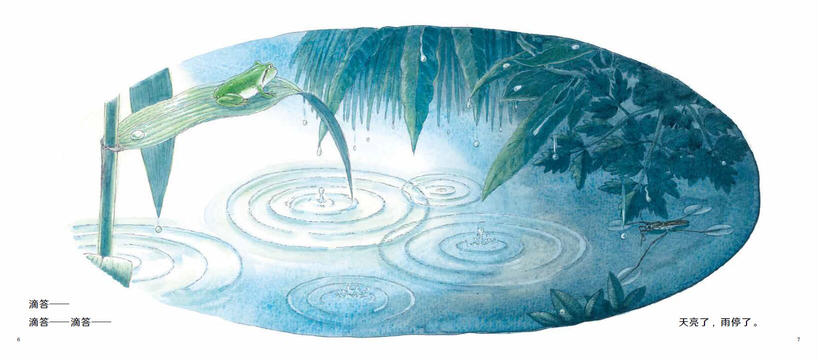 夜晚的池塘,聽見青蛙呱呱的叫聲,它在樹葉下躲雨。天亮了,雨停了,太陽一出來,蟲子們就出來了,響起了各種聲音。日本自然科學繪本大師松岡達英為讀者創作的雨后熱鬧的池塘,動物們發出各式的聲音,就像一場池塘里的交響樂。