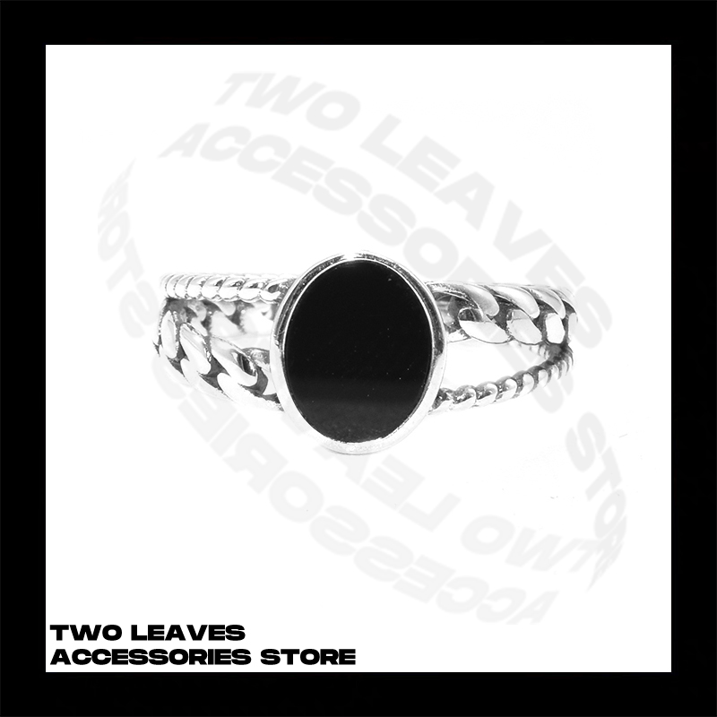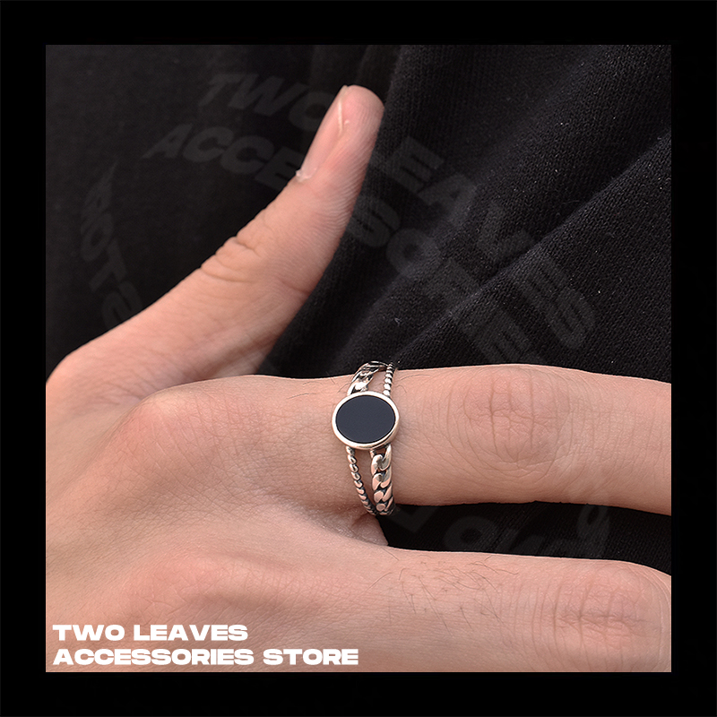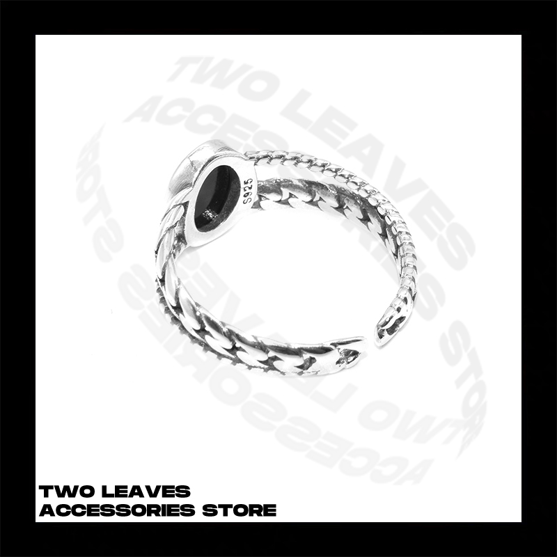 TWO LEAVES S925純銀復古黑瑪瑙開口戒指百搭潮流街頭男女款指環