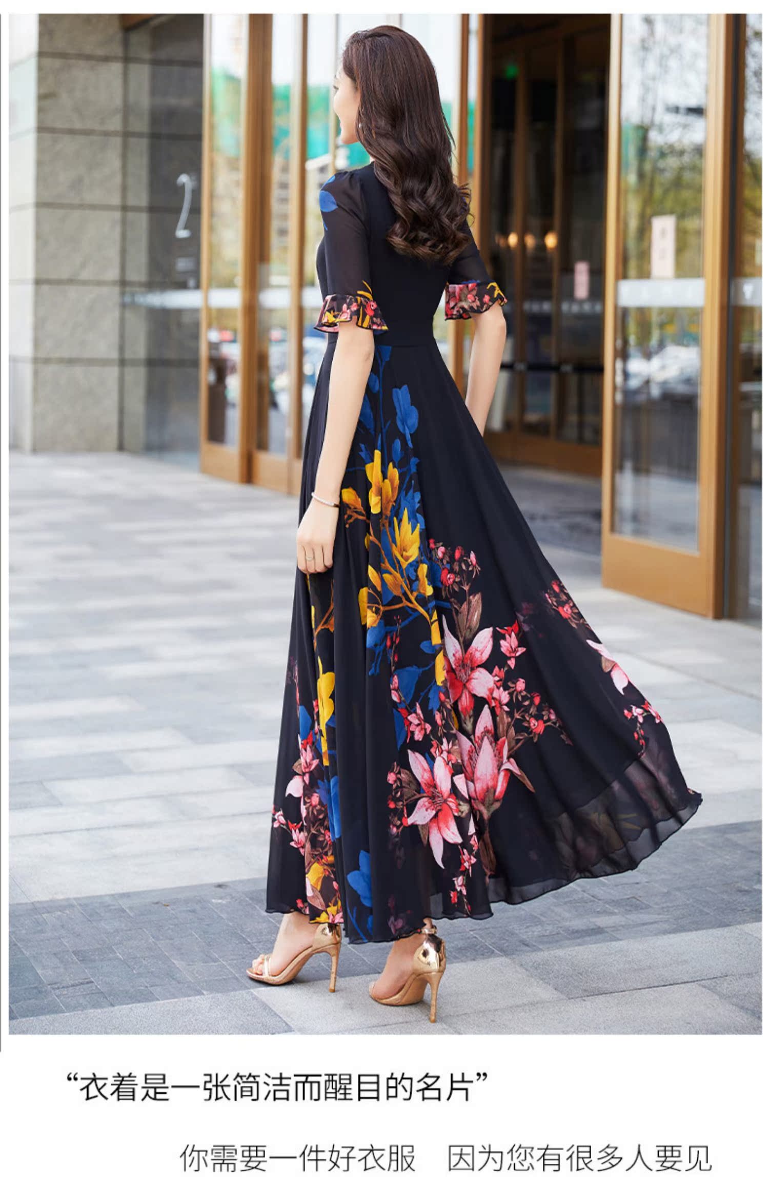 2023年新款春秋季大擺連衣裙收腰顯瘦旅游度假長裙雪紡裙沙灘裙子