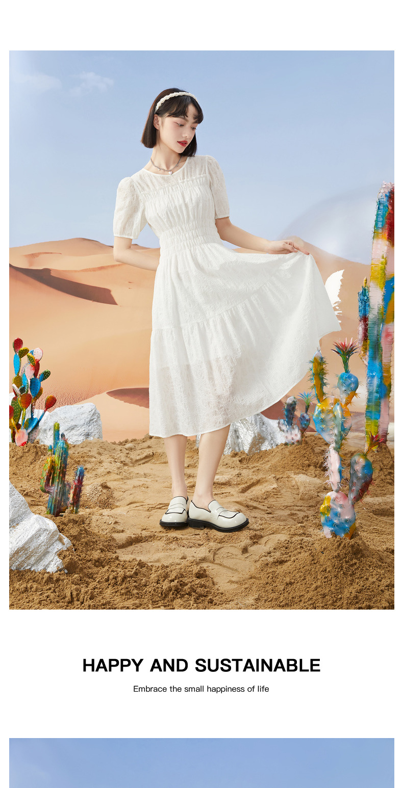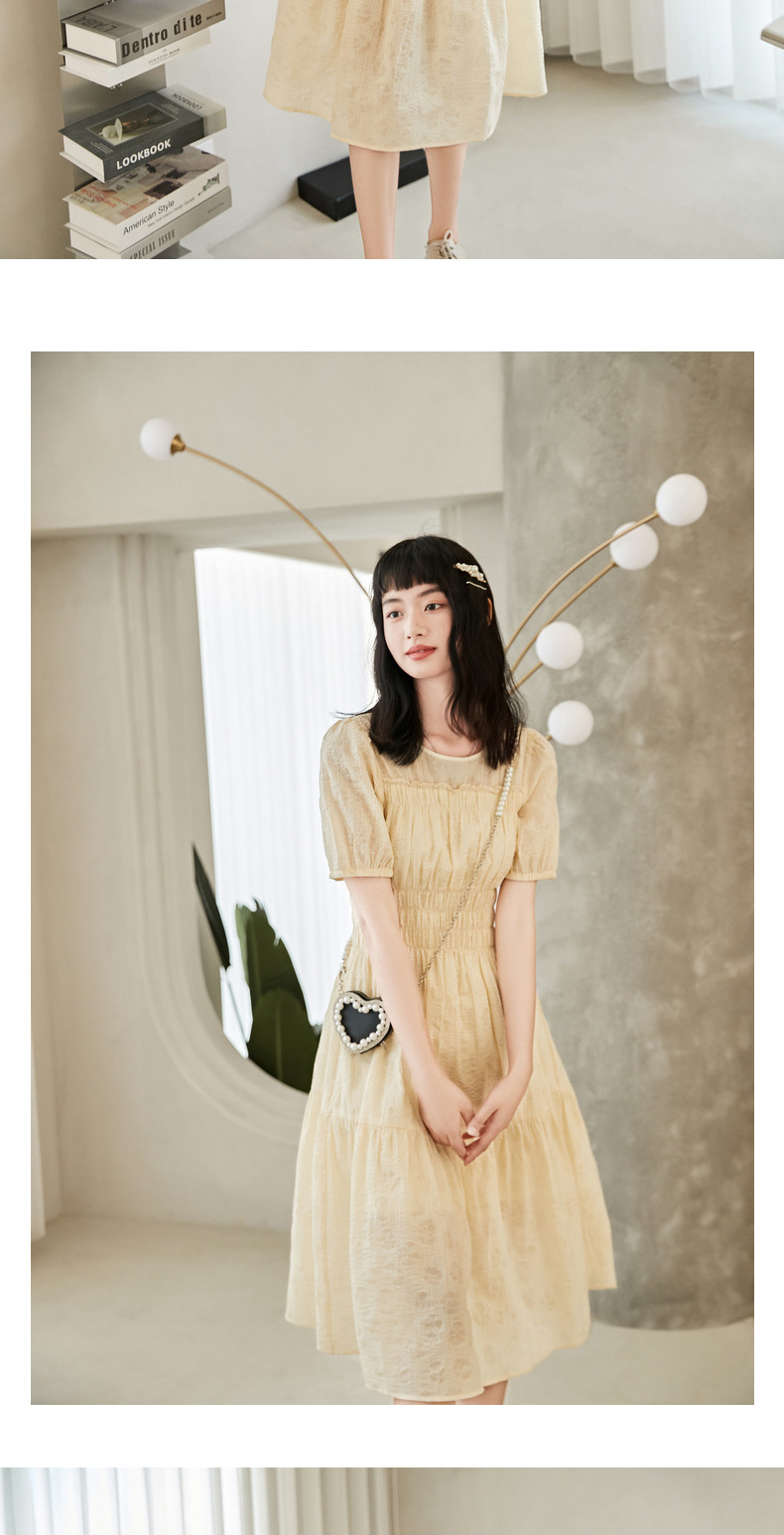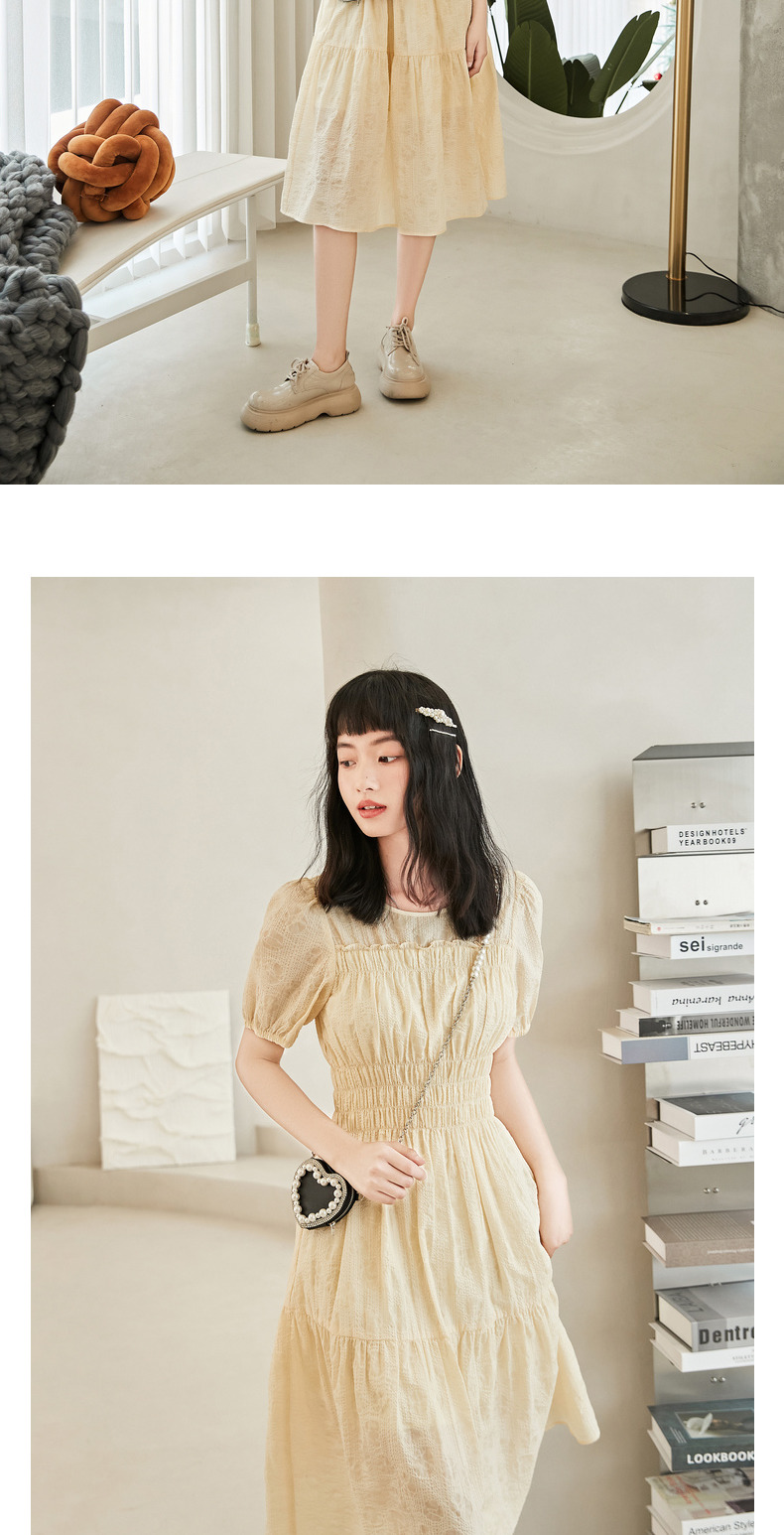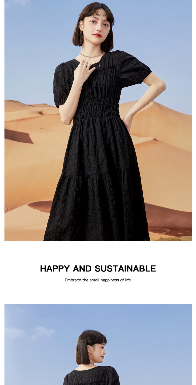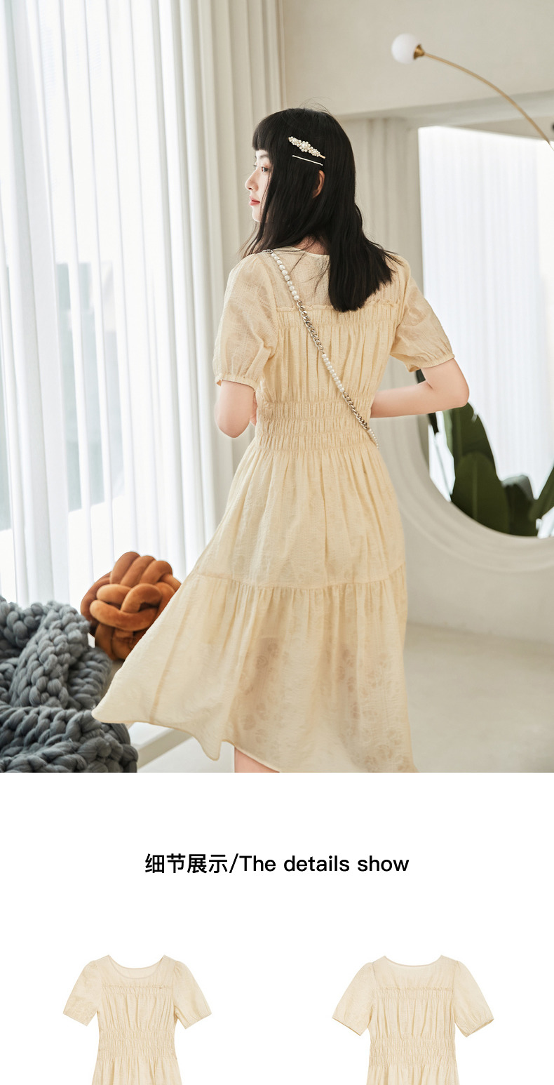 絲柏舍溫柔連衣裙2023夏裝新款女裝簡約圓領減齡泡泡袖捏褶中長裙