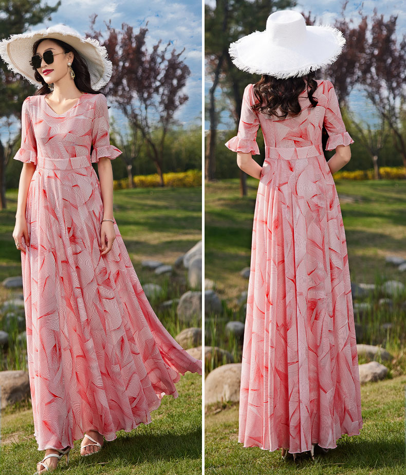 夏季粉色雪紡碎花連衣裙女長款到腳踝2023年新款氣質顯瘦超長裙子