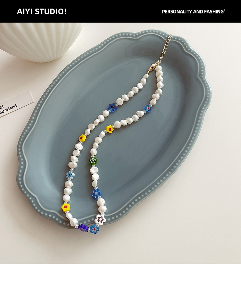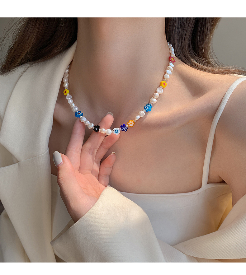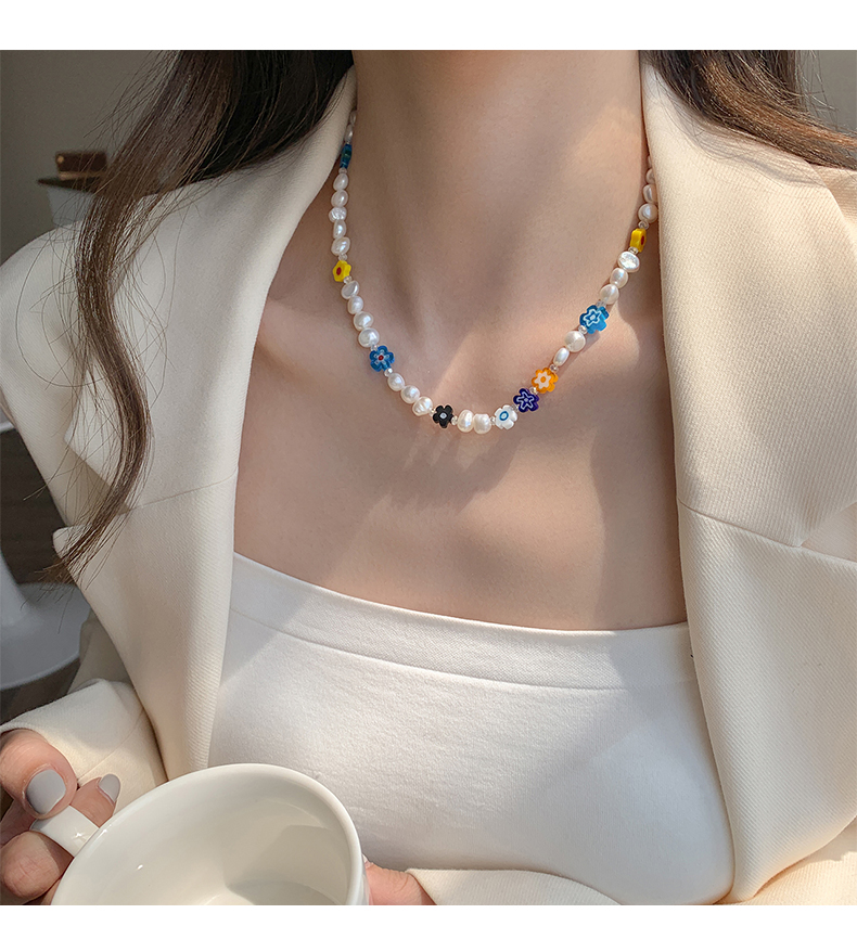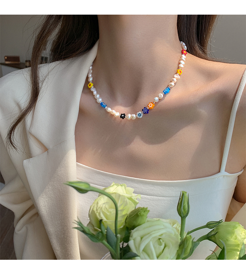 彩色花朵淡水珍珠毛衣項鏈女款高級設計感小眾頸鏈復古串珠鎖骨鏈