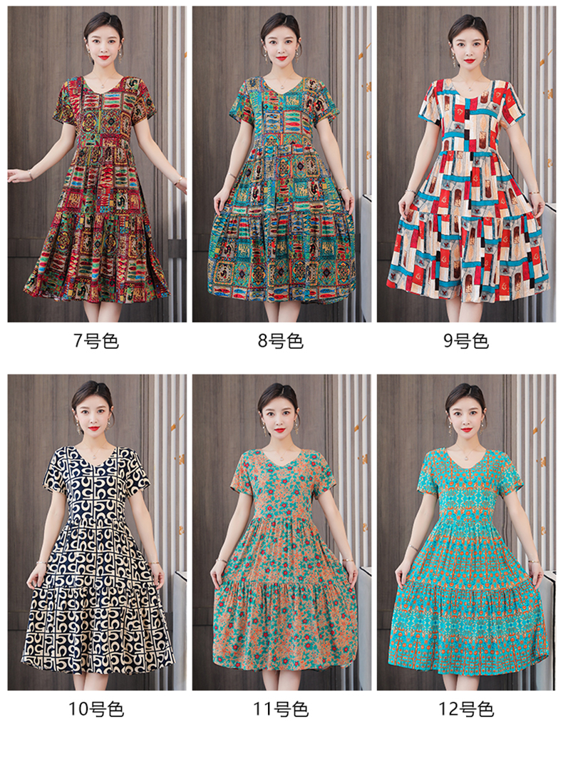媽媽棉綢連衣裙夏中老年女裝寬松大碼人造棉短袖碎花中長款裙子