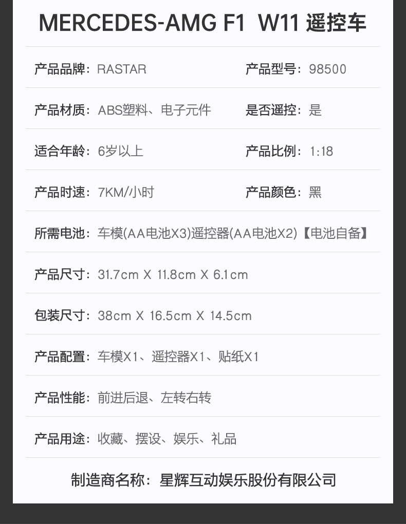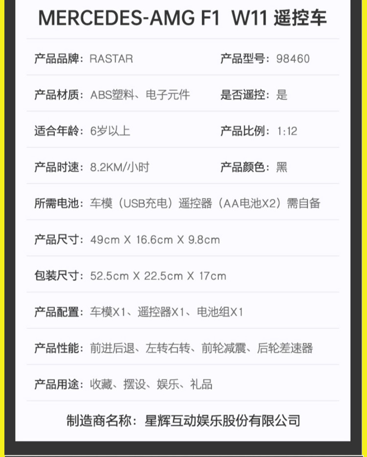 星輝奔馳遙控汽車梅賽德斯AMG車隊F1賽車大號電動模型車玩具車模