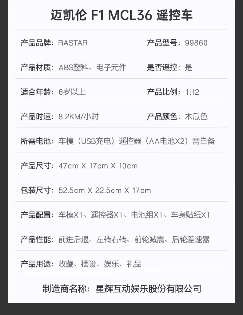 RASTAR星輝1:12奔馳梅賽德斯邁凱倫法拉利F1方程式賽車遙控車玩具