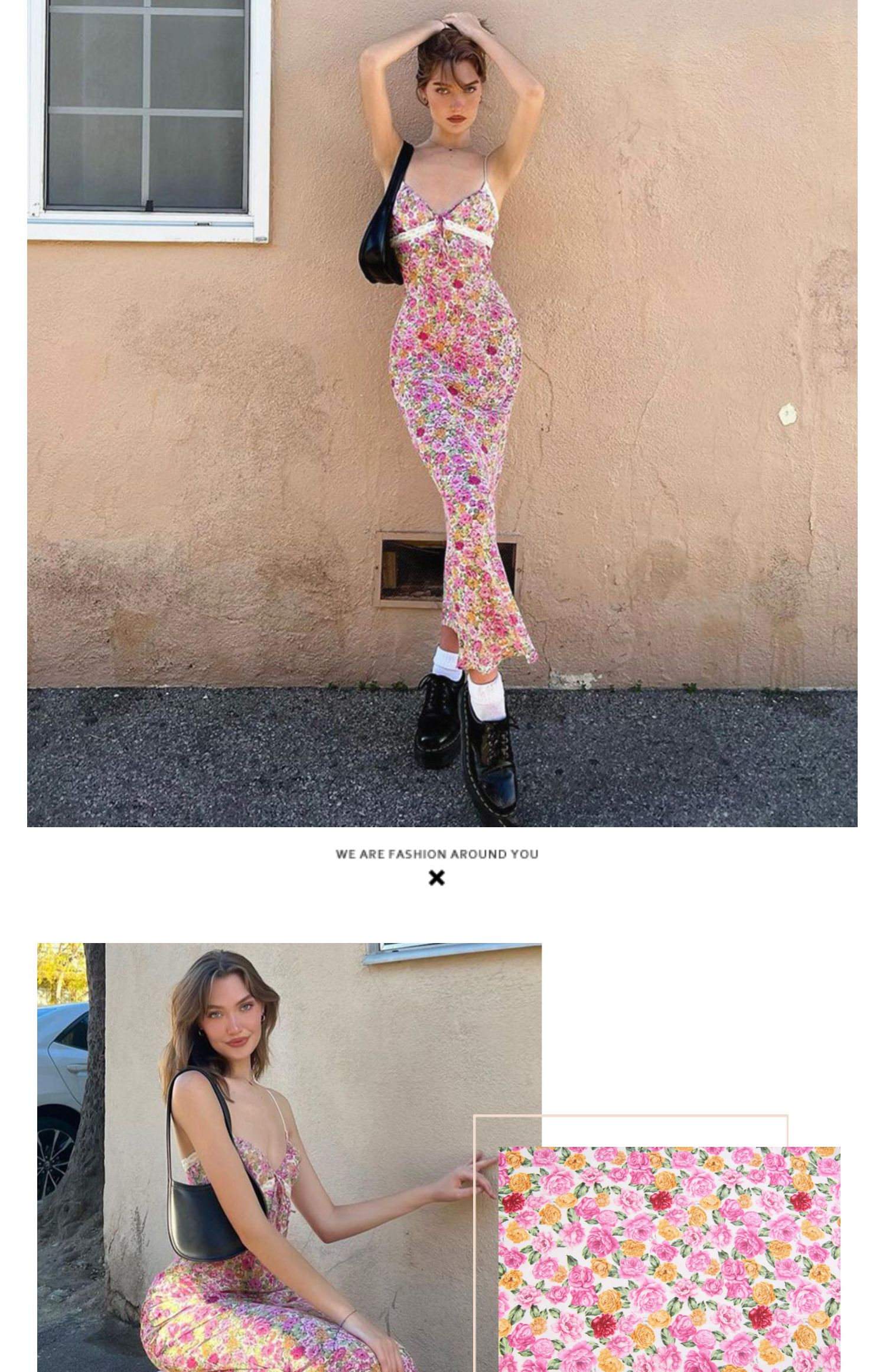 WEIRD PUSS 歐美氣質優雅慵懶風清新少女收腰吊帶連衣裙碎花長裙
