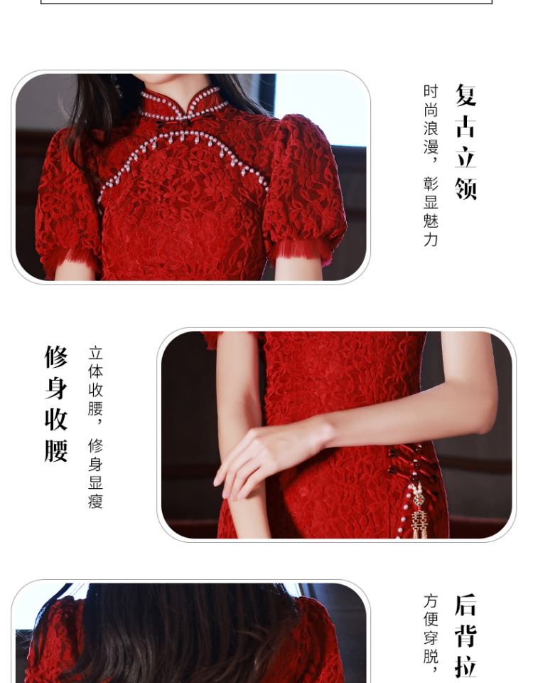 旗袍敬酒服2023新款新娘中式結婚訂婚禮服夏季刺繡蕾絲紅色連衣裙