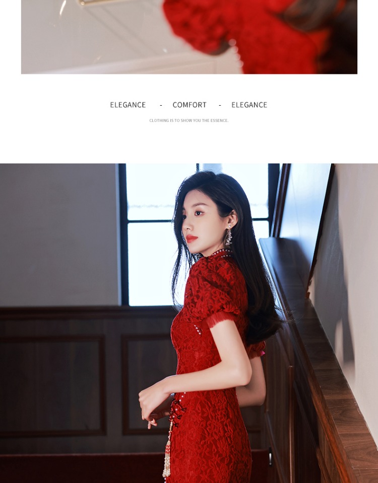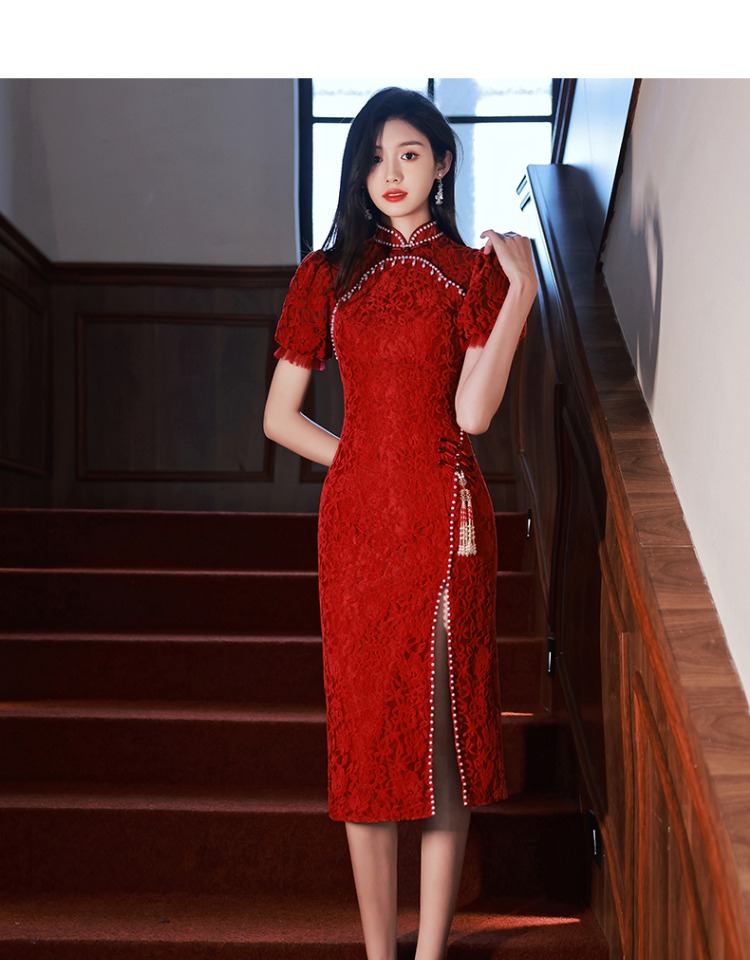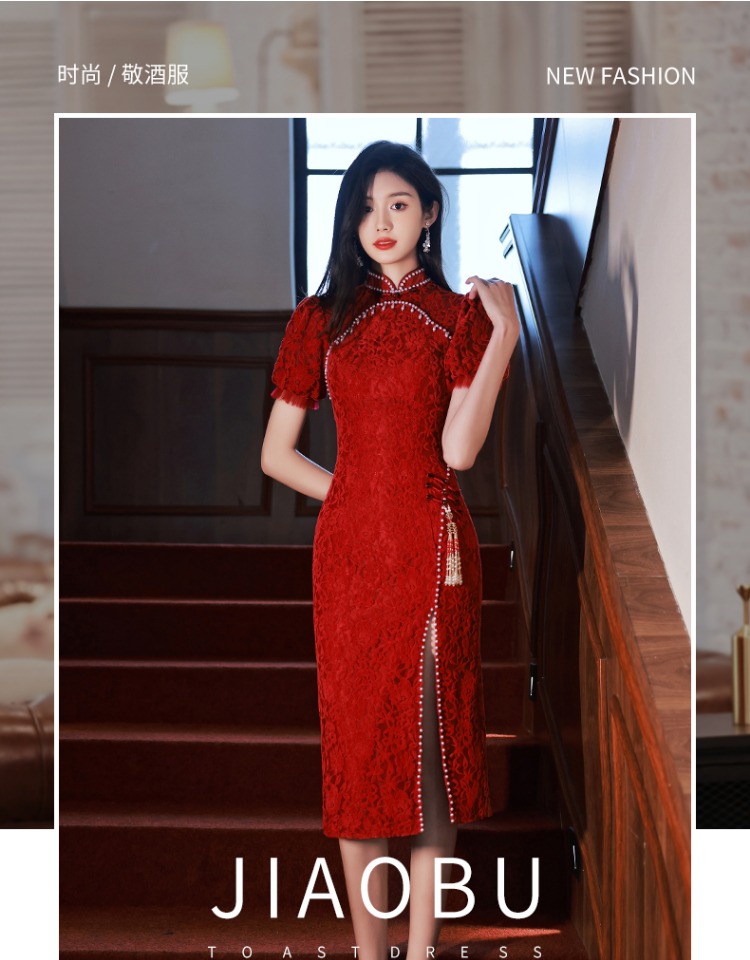 旗袍敬酒服2023新款新娘女夏季高級感紅色訂婚禮服開叉蕾絲中長款