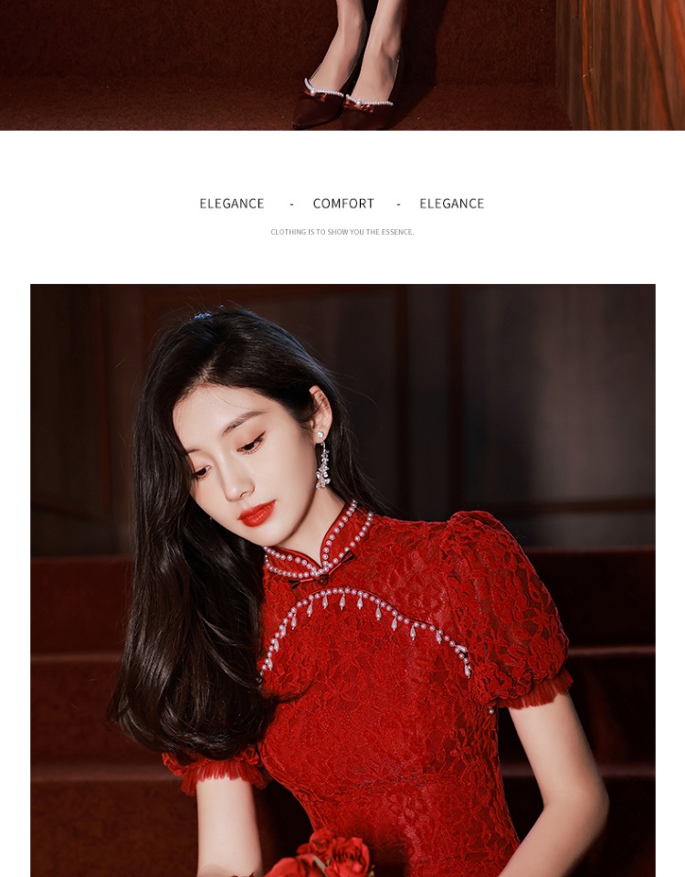 旗袍敬酒服新娘高級感夏季魚尾蕾絲回門訂婚紅色禮服中式結婚高端