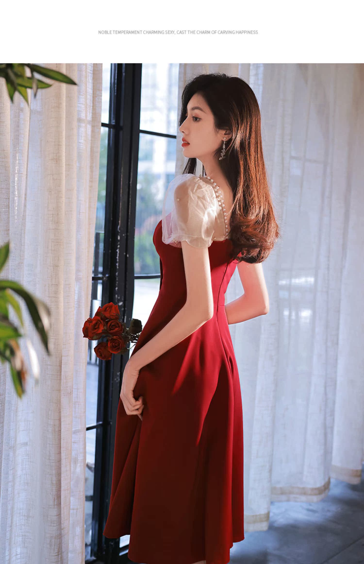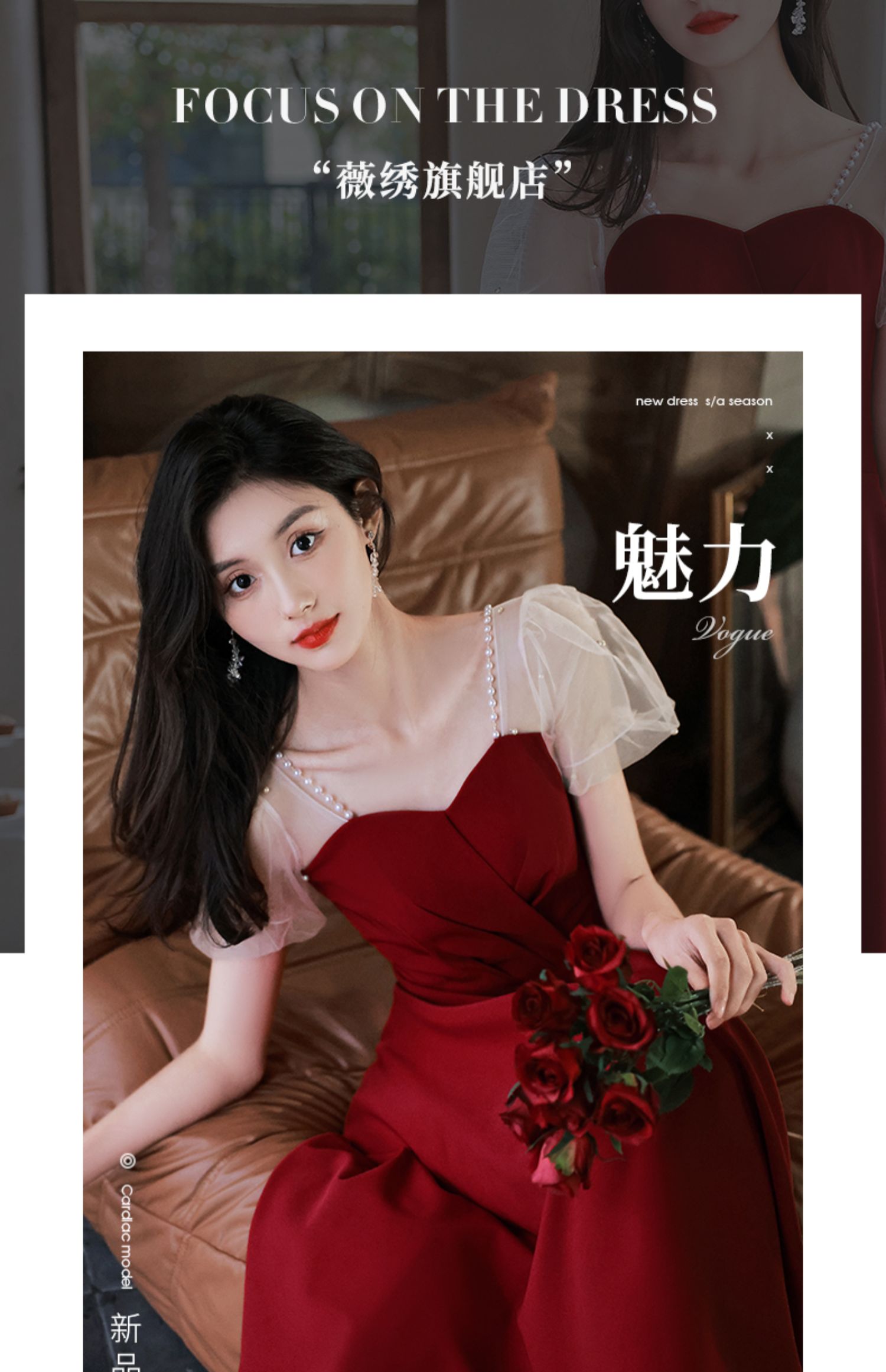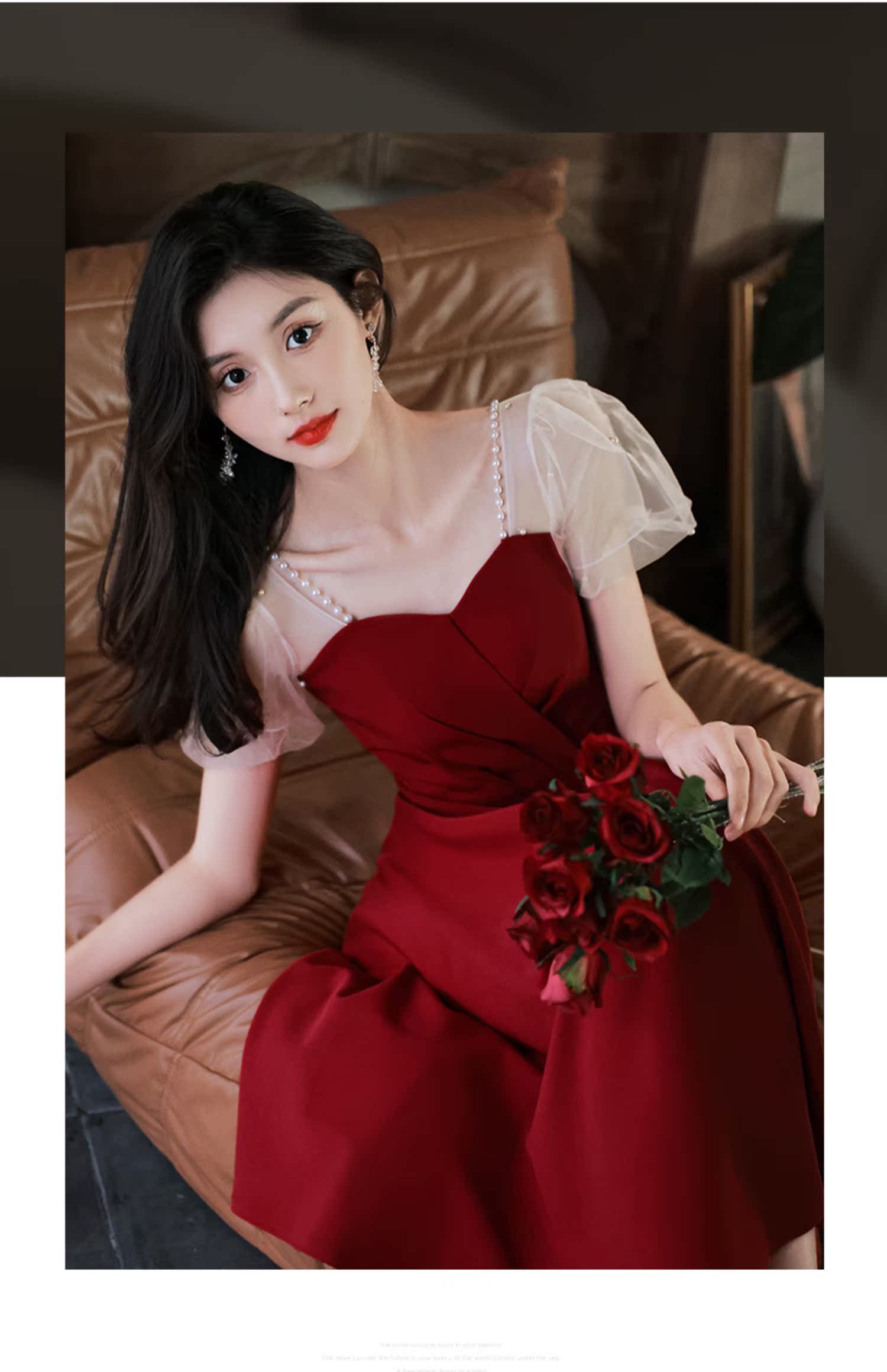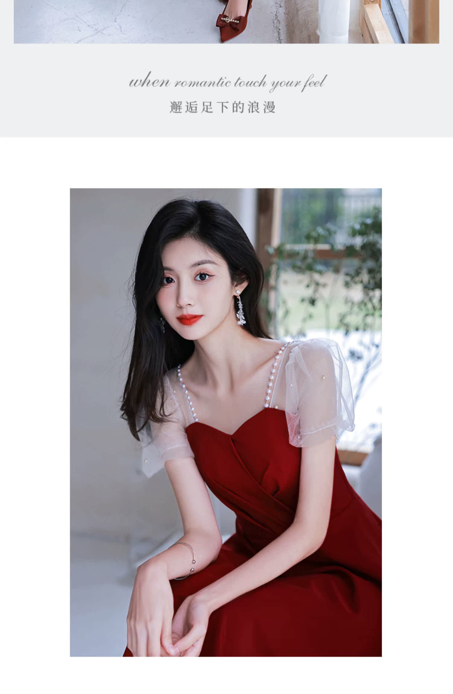 法式敬酒服新娘夏季紅色小晚禮服連衣裙平時可穿訂婚回門便裝紗袖