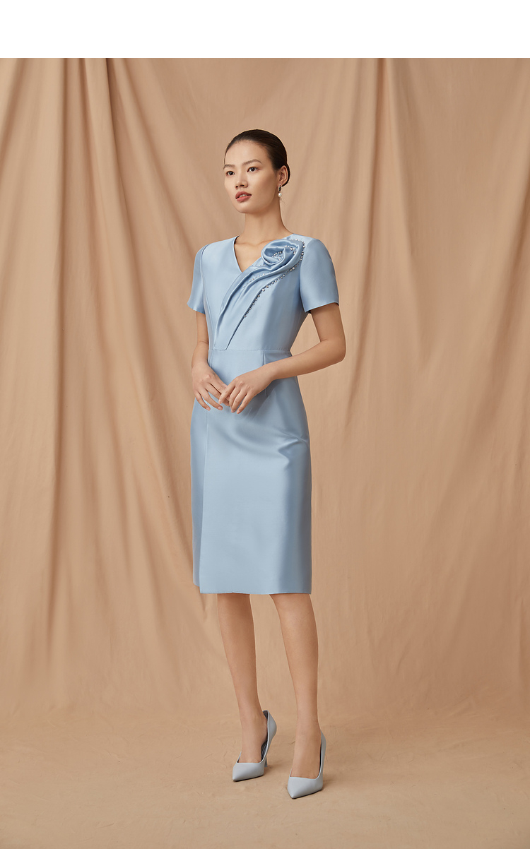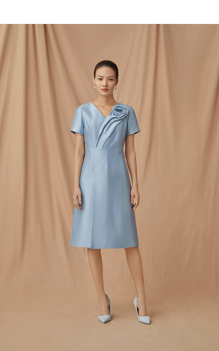 歌中歌新品2023夏季天空藍立體玫瑰花通勤v領連衣裙5C32205720
