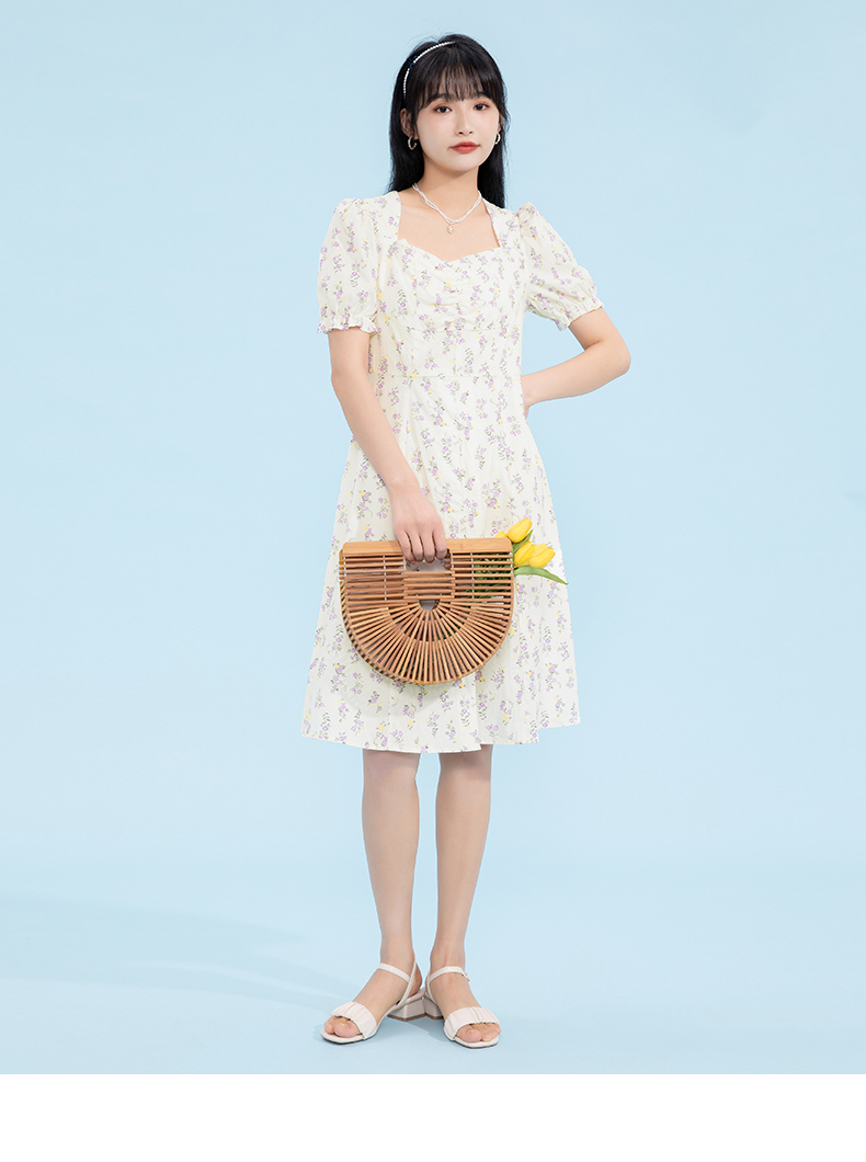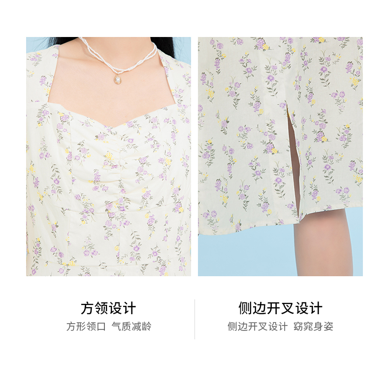 熱風23夏季新款女士方領碎花開叉泡泡袖短袖連衣裙甜美
