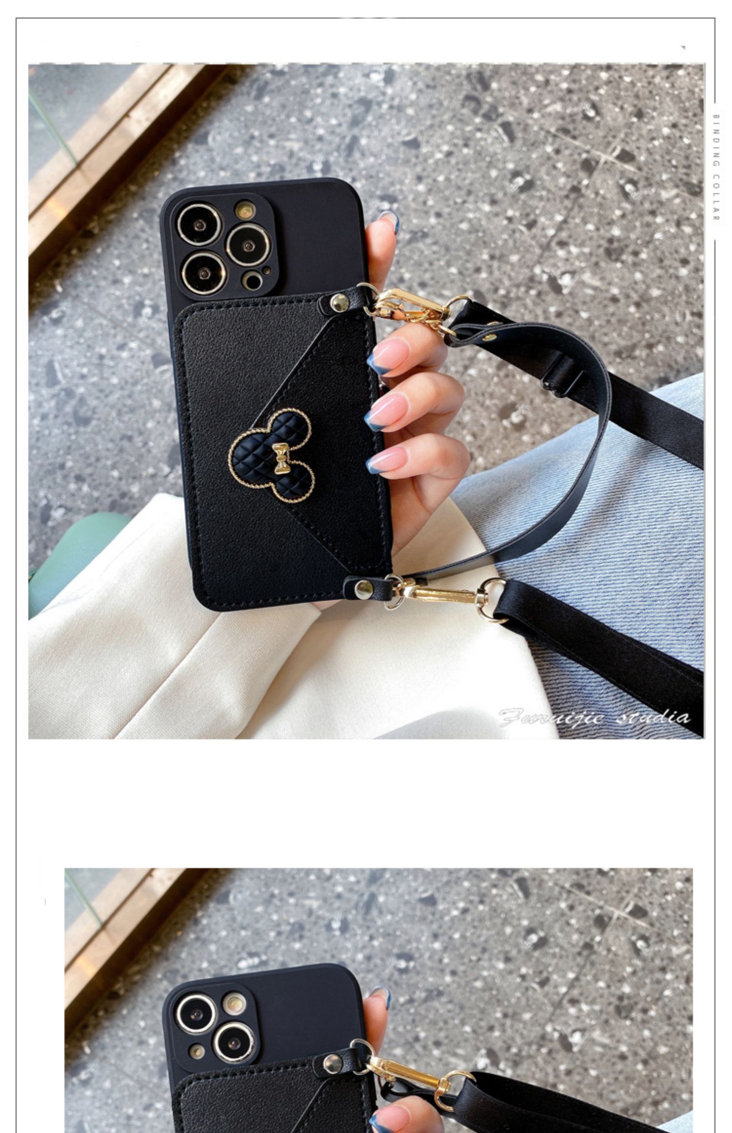 黑色小香風米妮零錢包適用蘋果13Promax手機殼新款14女iPhone12皮質11Promax斜挎Xr背帶xsmax掛繩8plus硅膠套