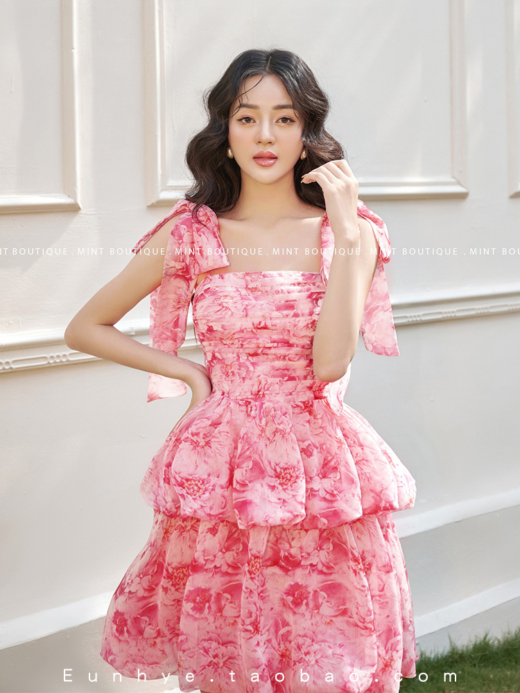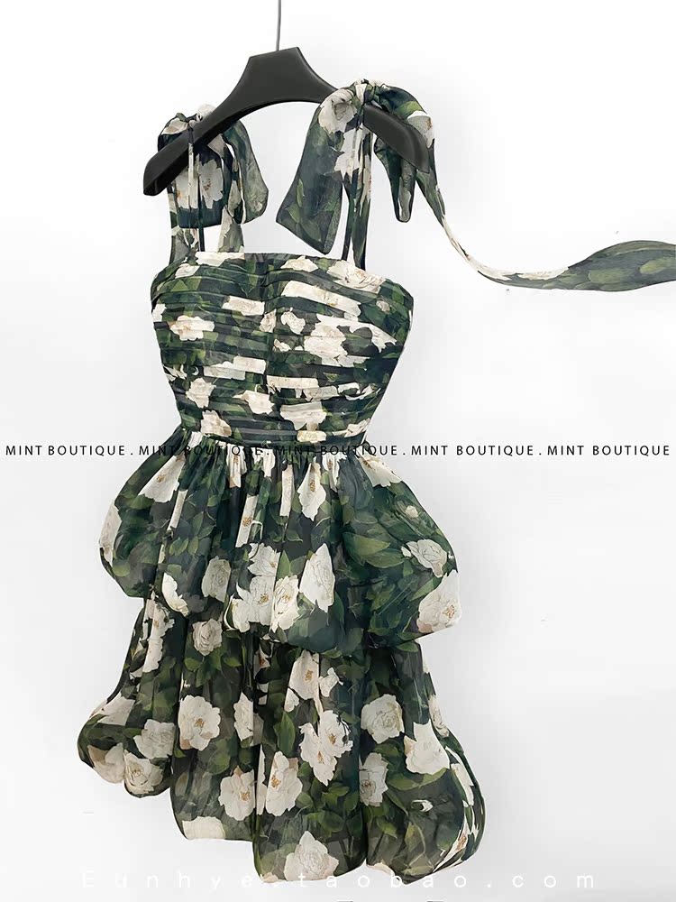 越南小眾設計師MINT 2022夏季新款吊帶蝴蝶結碎花三色甜美連衣裙