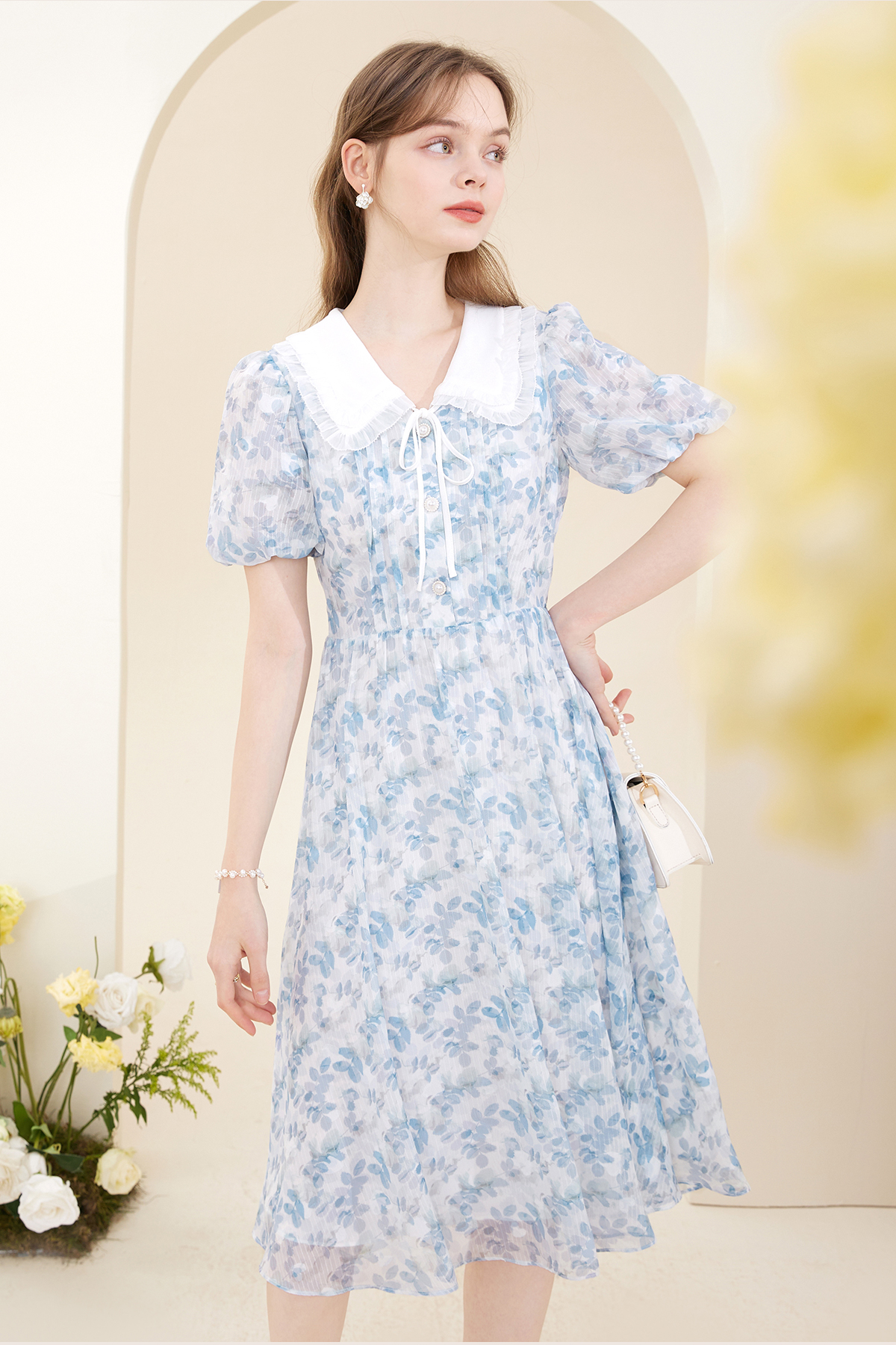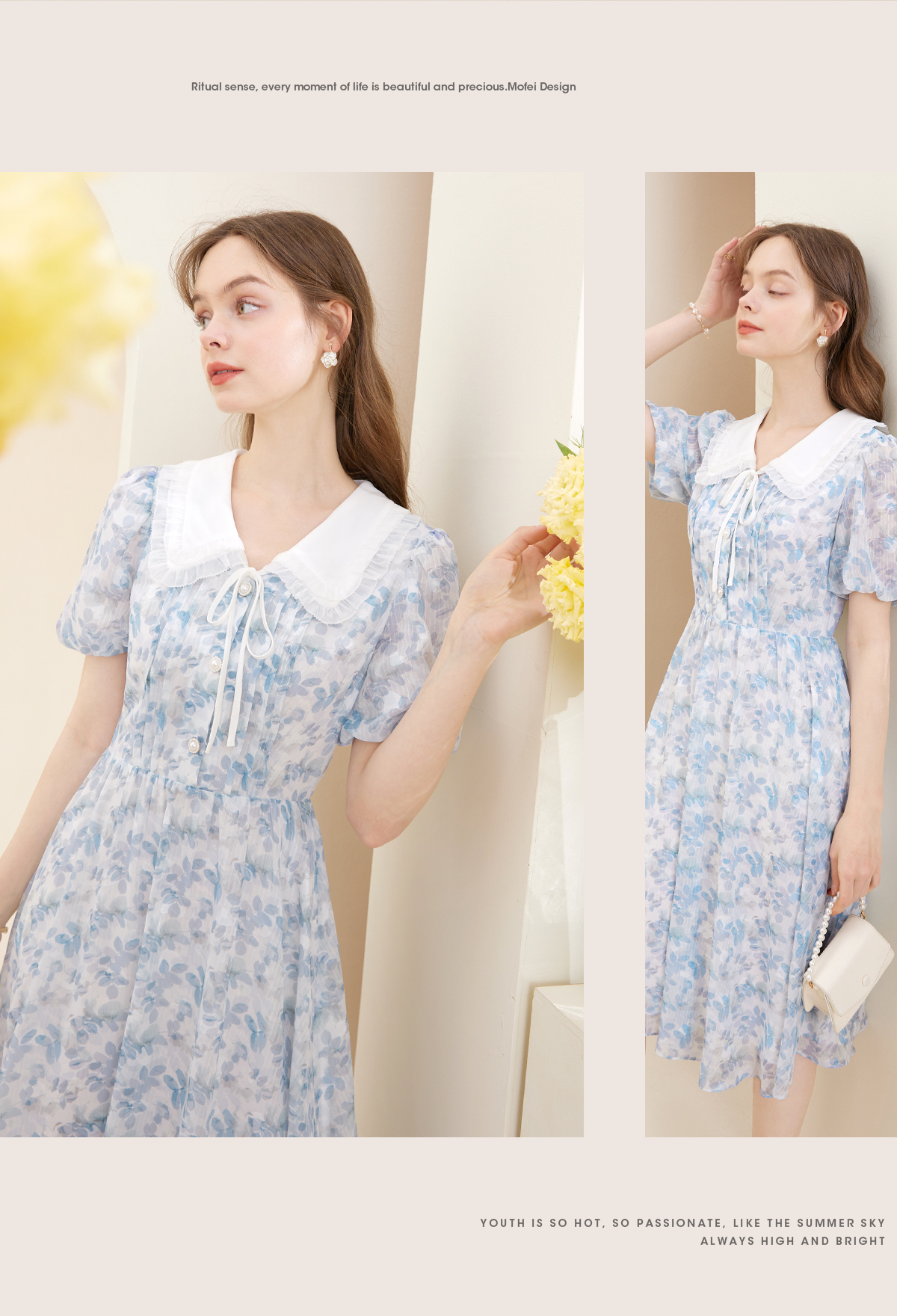 夢山 雪紡印花連衣裙2022新款女夏蝴蝶結雙層花邊娃娃領甜美裙子