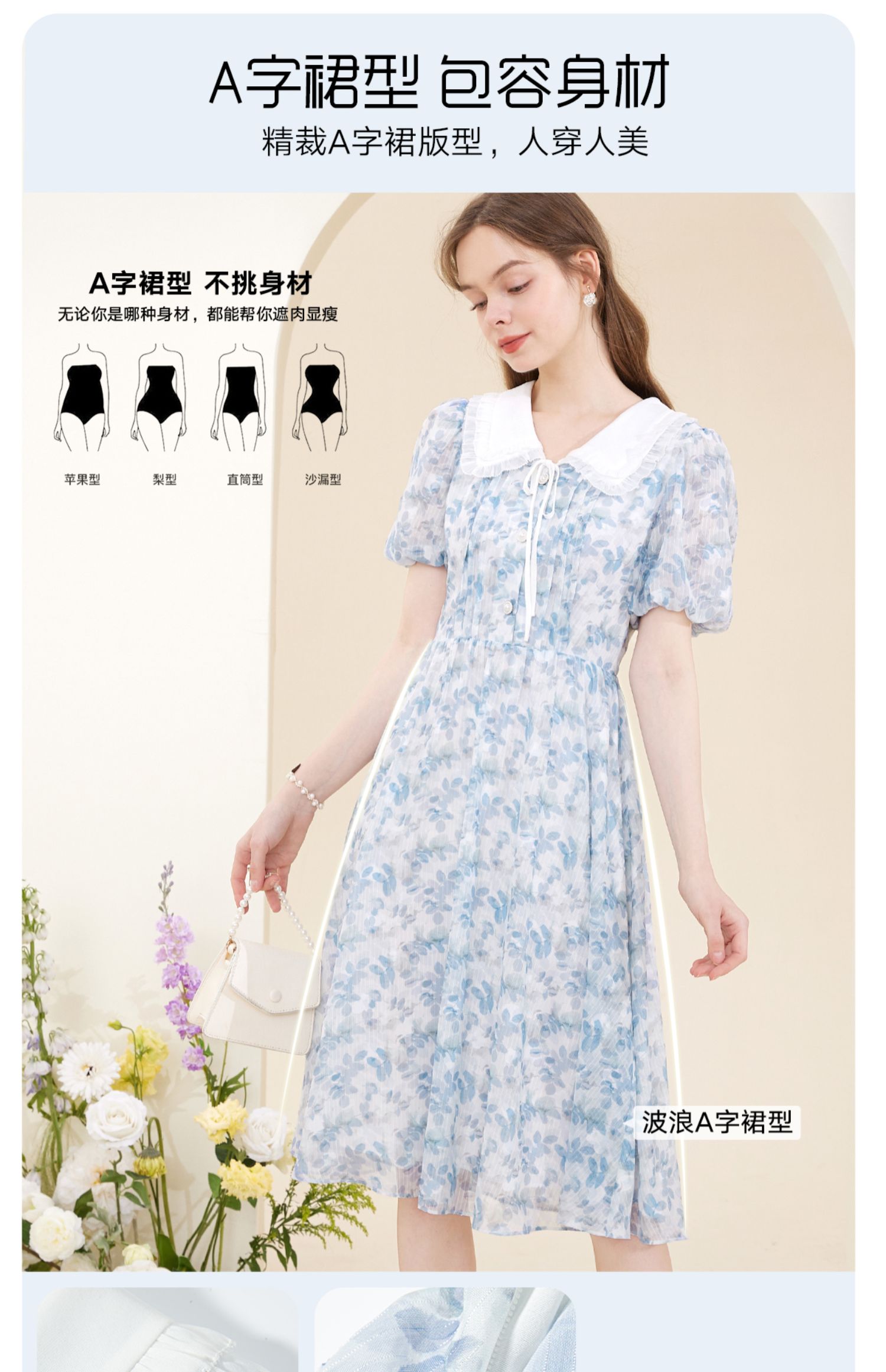 衣紗布菲畫嬈 水墨雪紡印花連衣裙2023女新款夏季娃娃領別致裙子