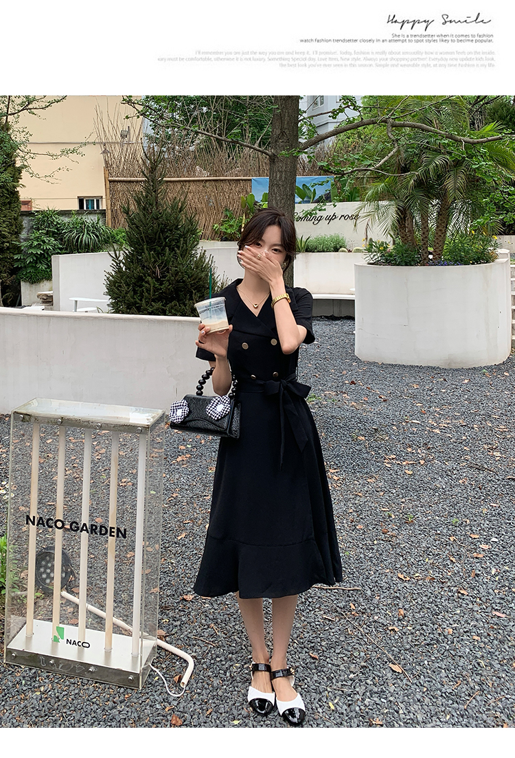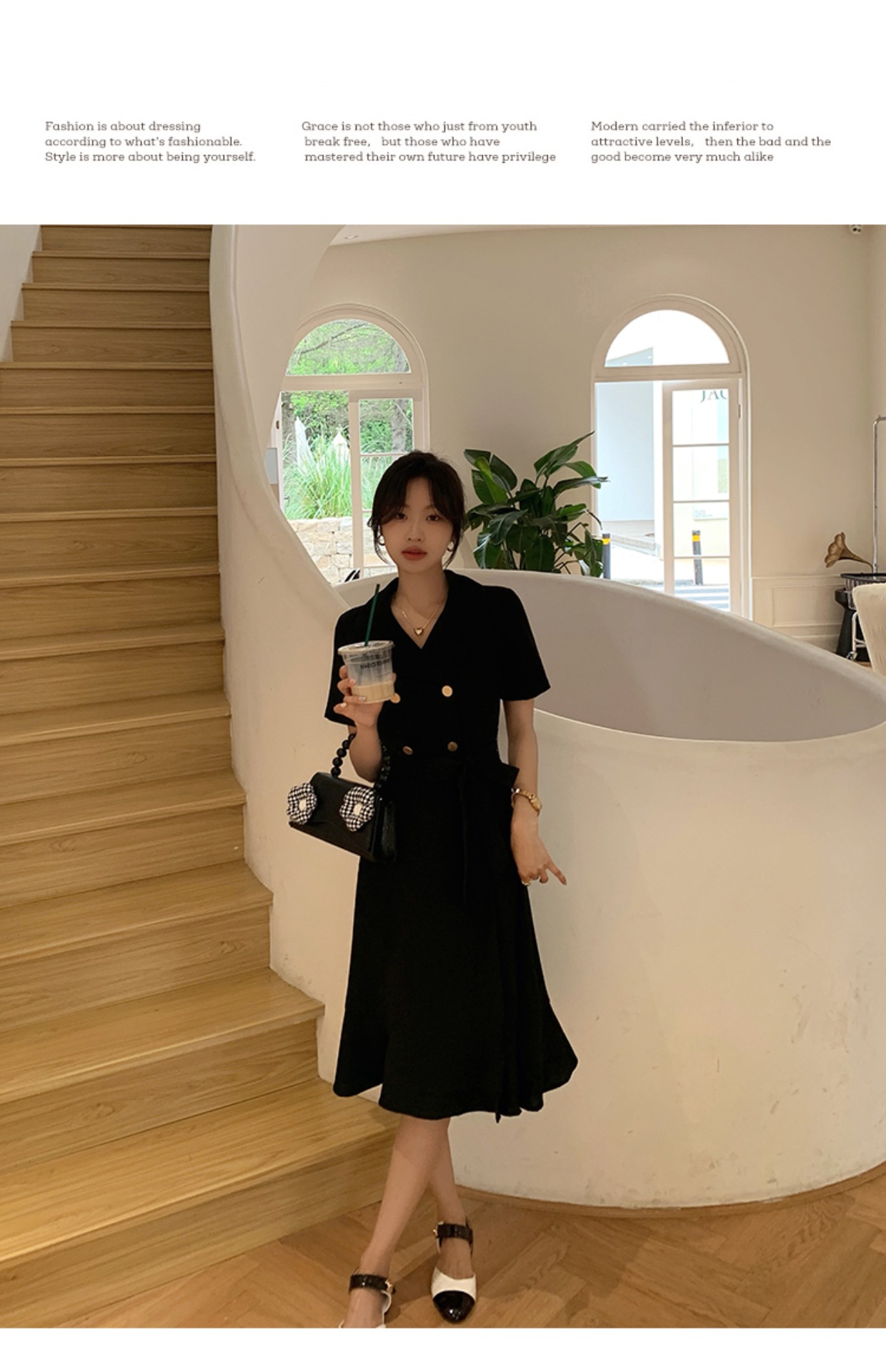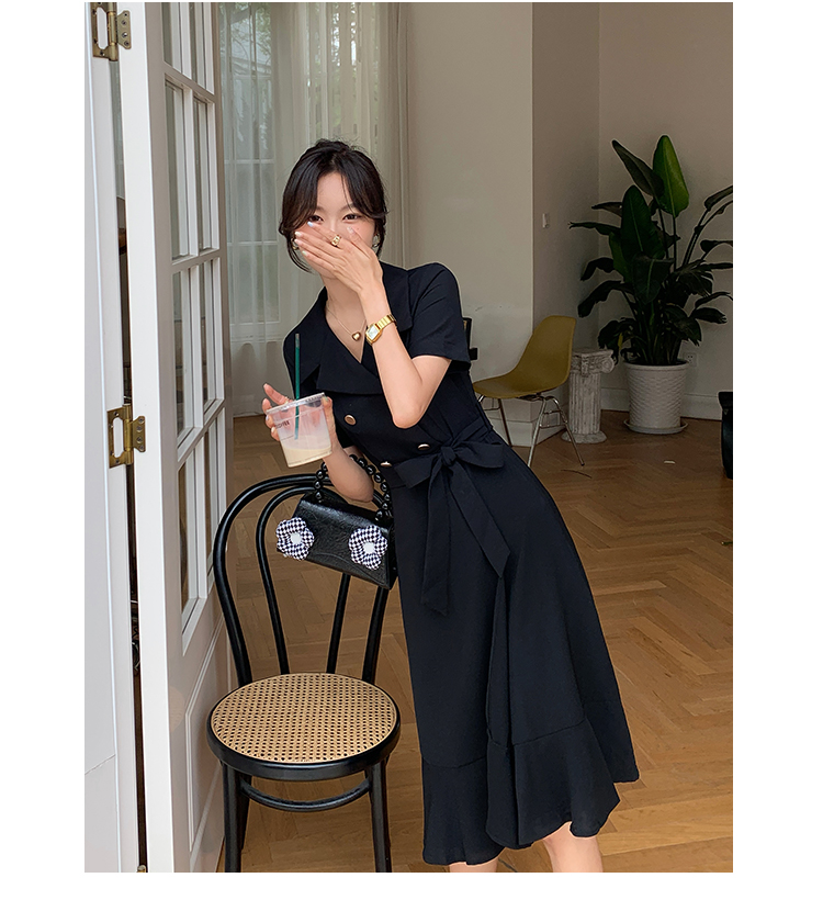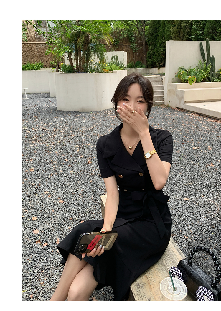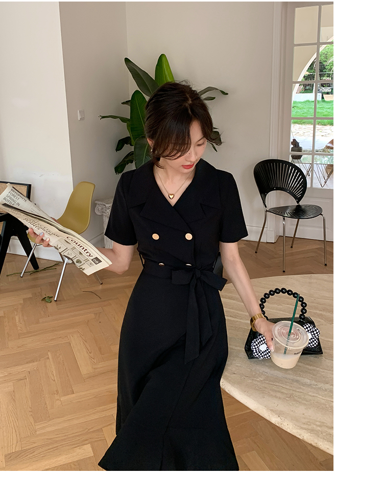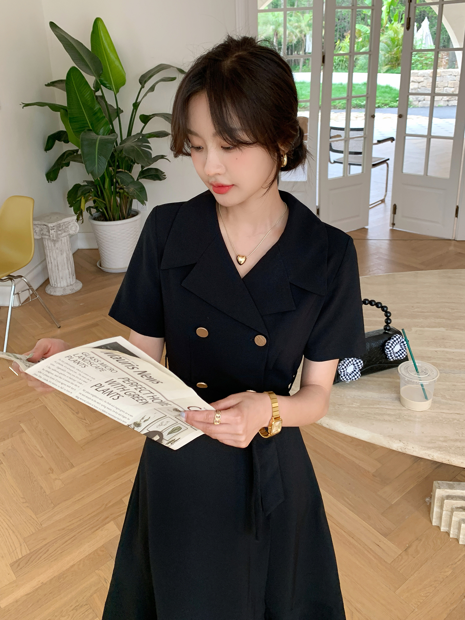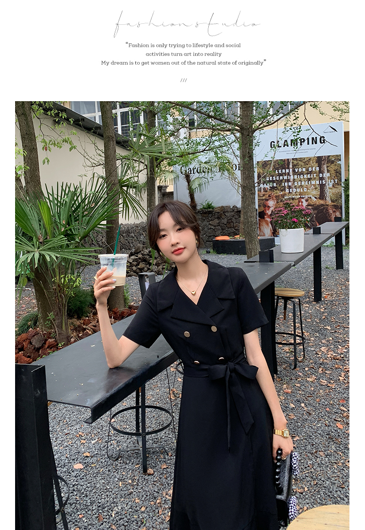 赫本風小黑裙女2023夏新款法式御姐風雙排扣顯瘦連衣裙短袖西裝裙