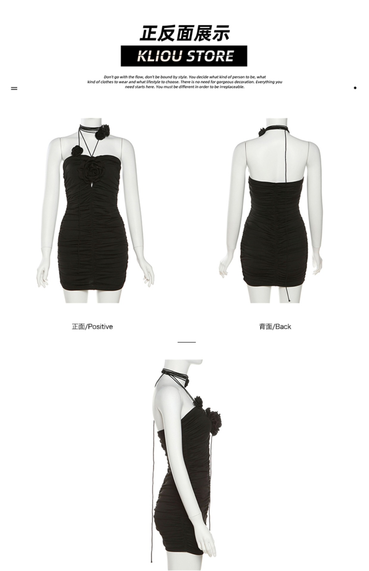 KLIOU 清冷氣質暗黑玫瑰花掛脖連衣裙女設計感緊身顯身材包臀短裙
