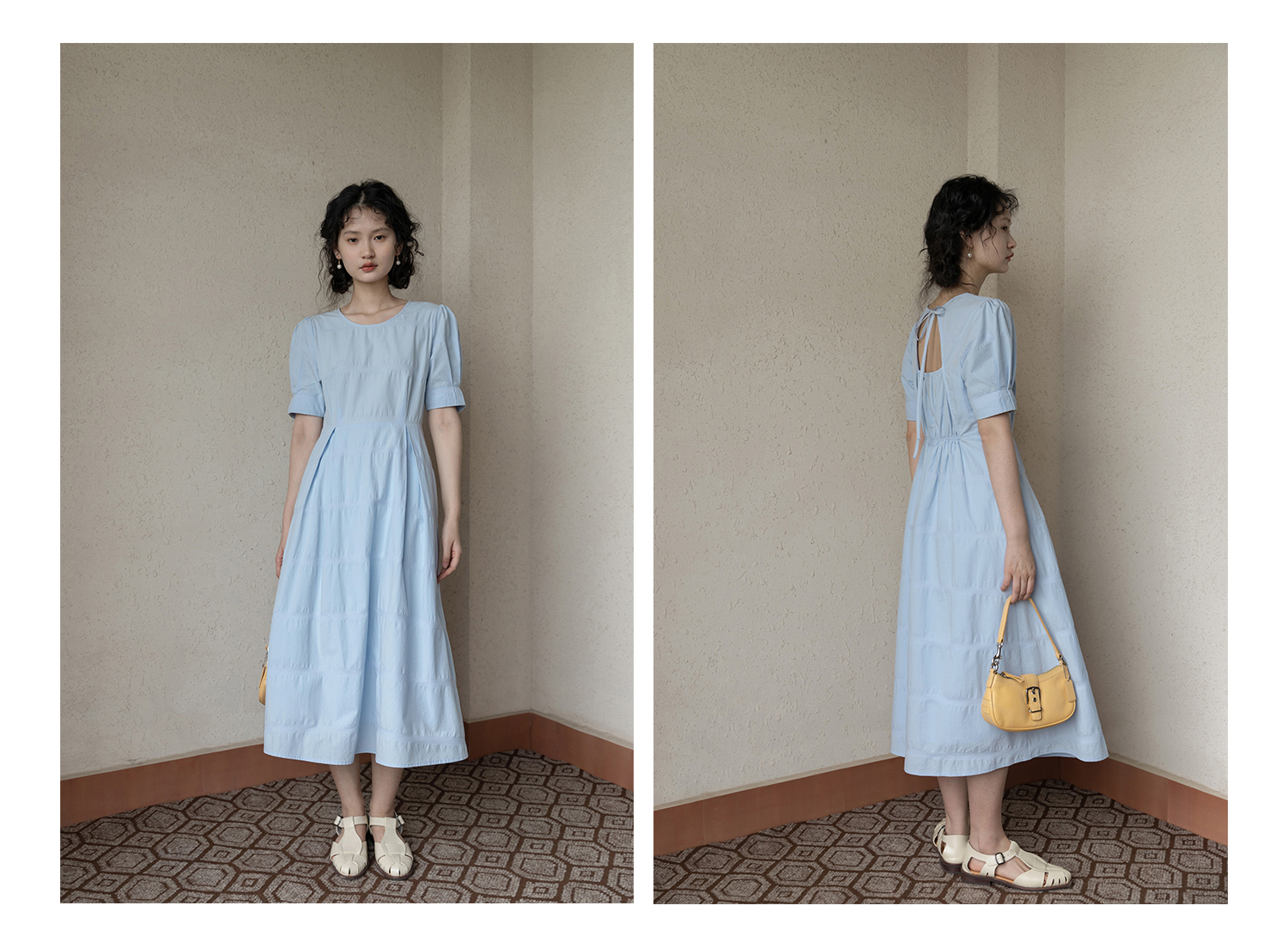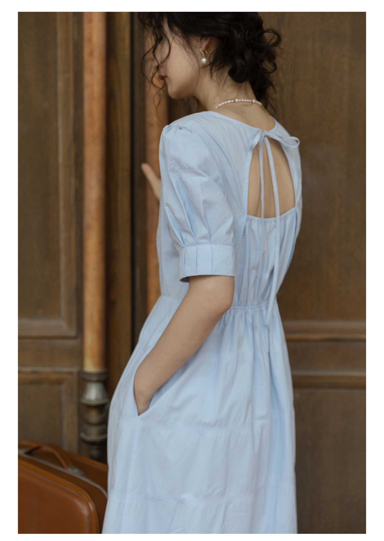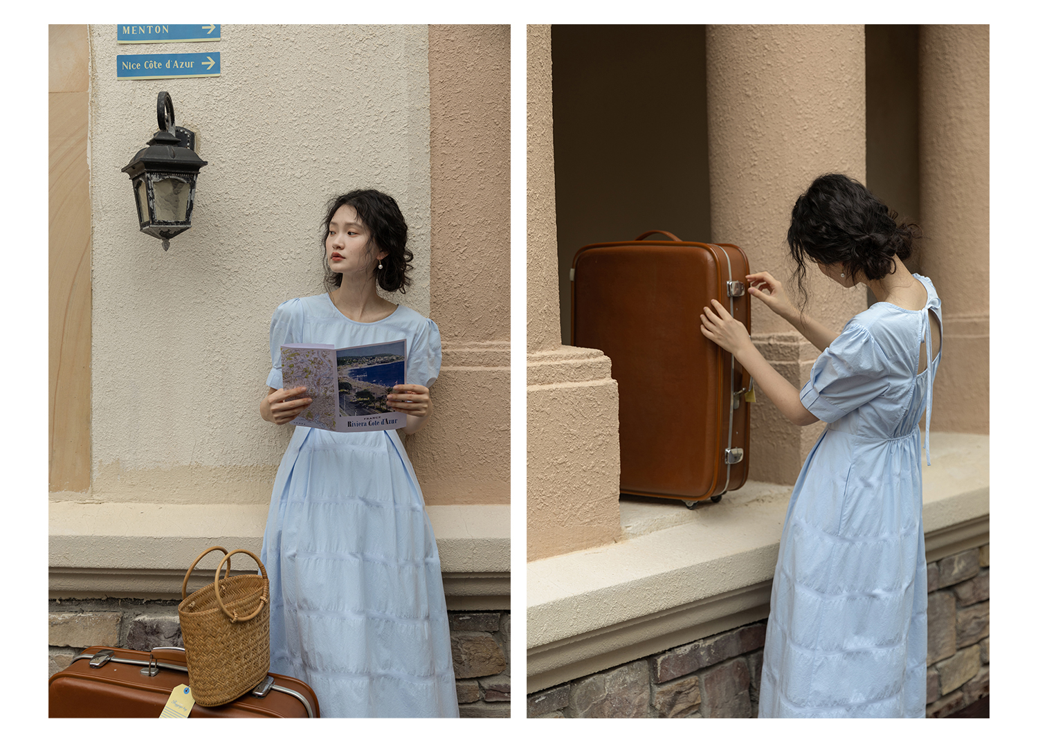 LLANO綁帶鏤空babyblue連衣裙復古假日南法燈籠袖露背中長裙女夏