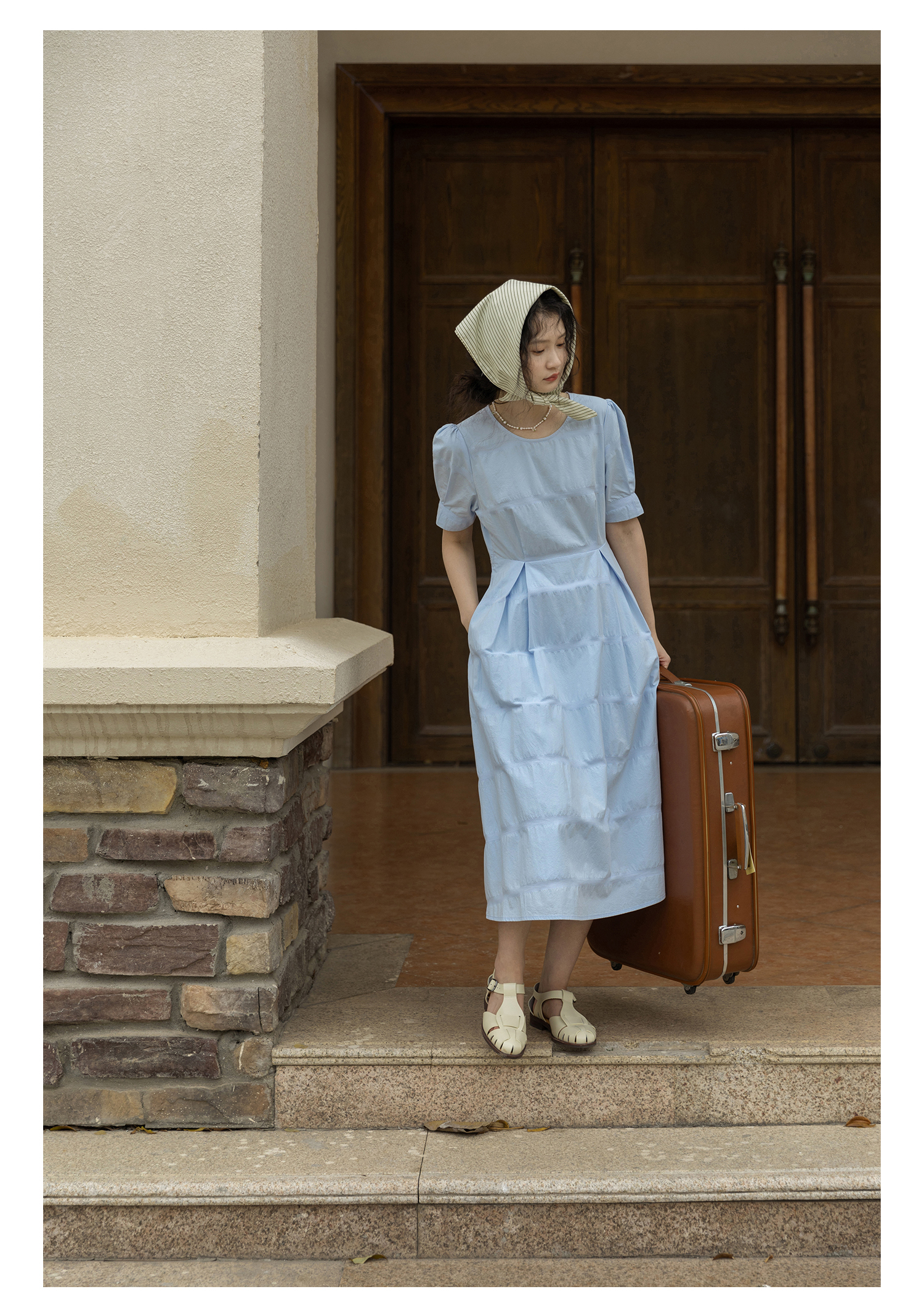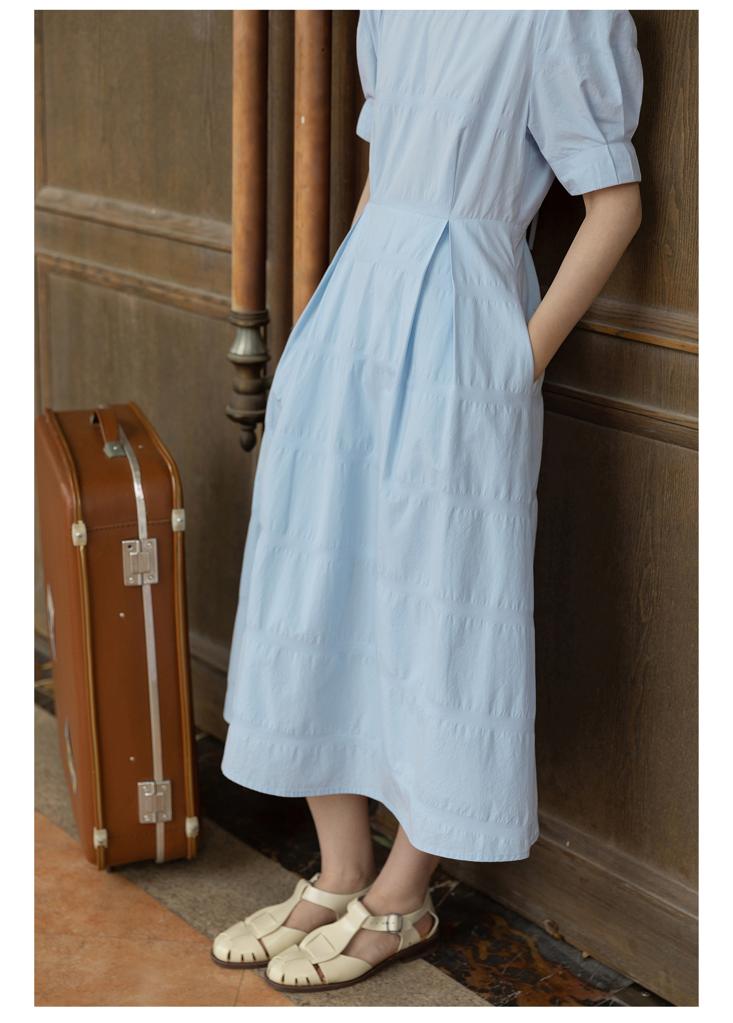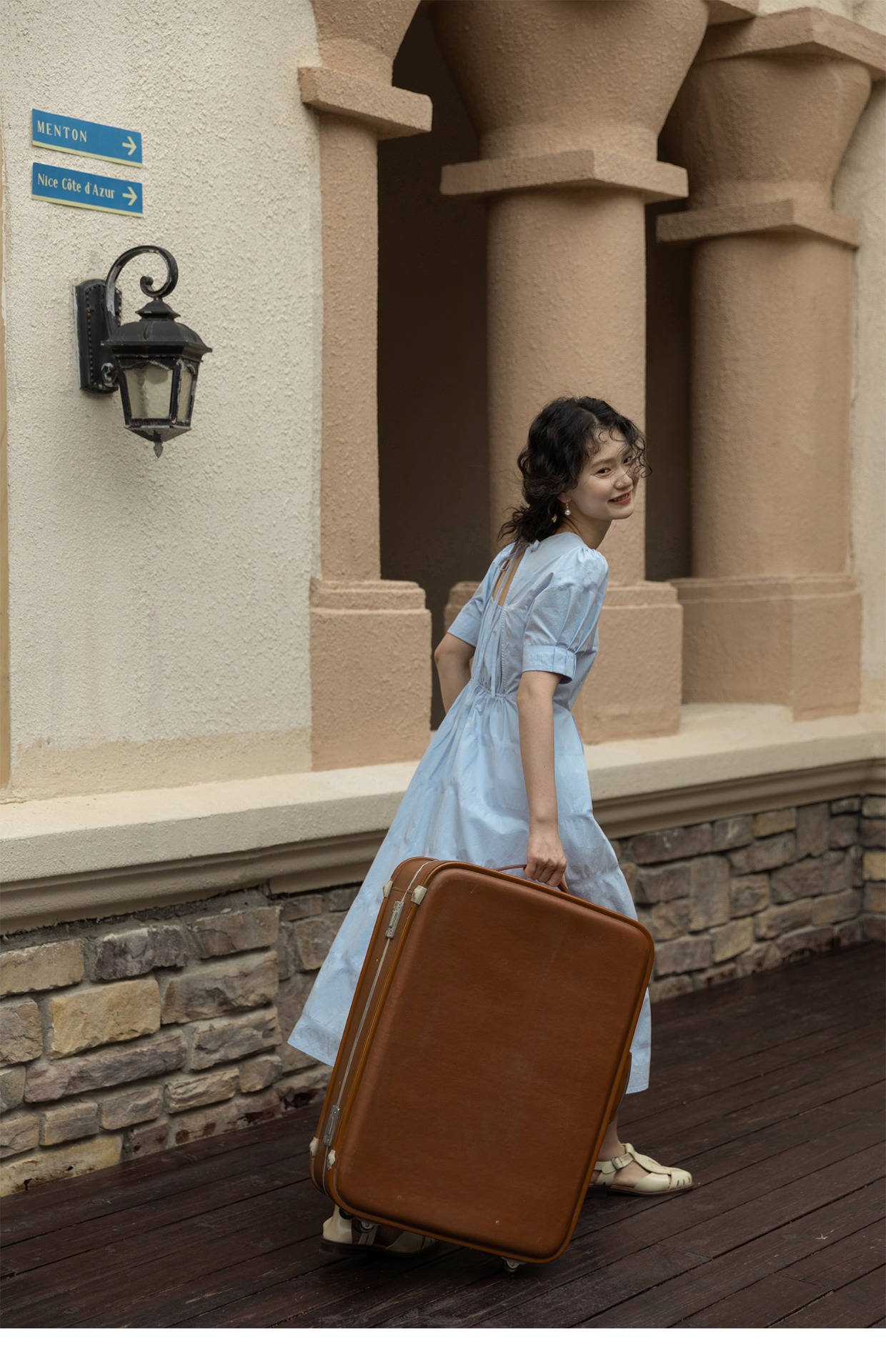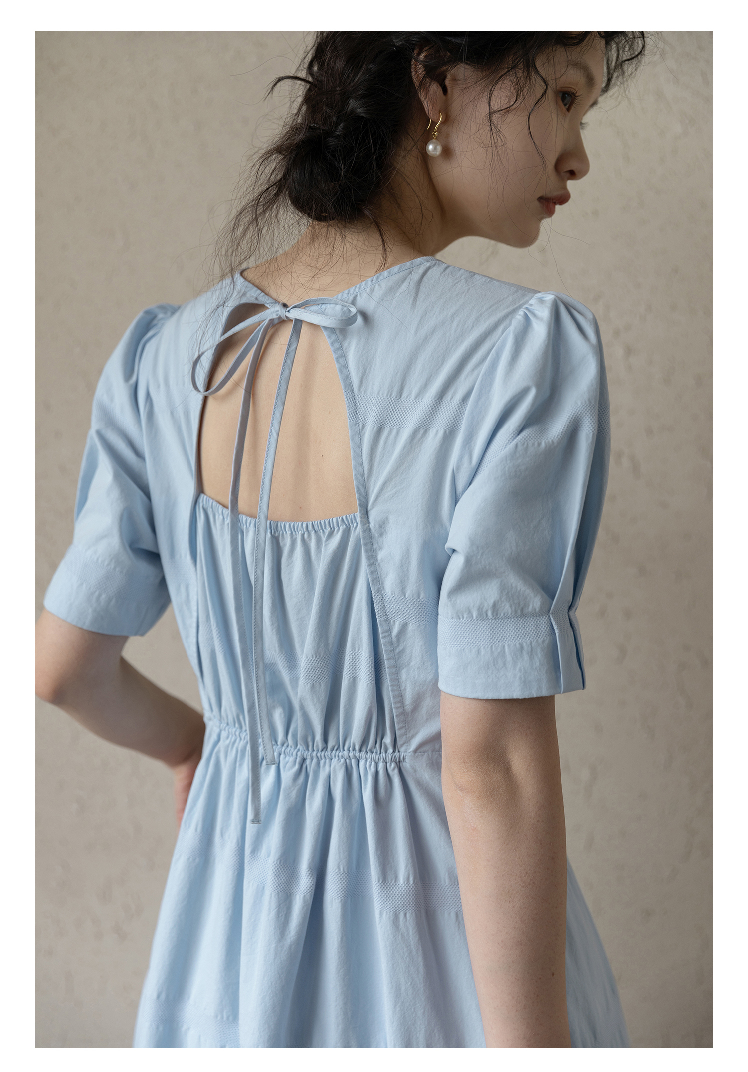 LLANO綁帶鏤空babyblue連衣裙復古假日南法燈籠袖露背中長裙女夏
