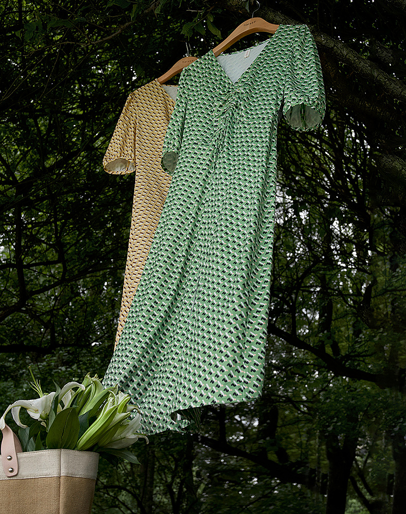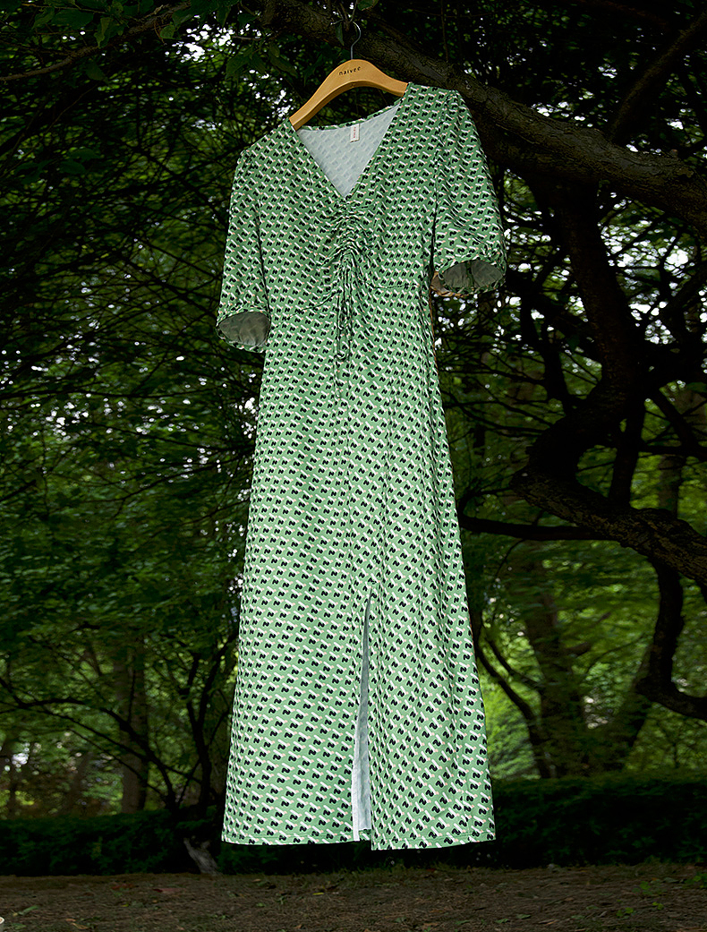 [買三贈一]naivee納薇法式復古V領現代幾何冰絲涼爽印花連衣裙