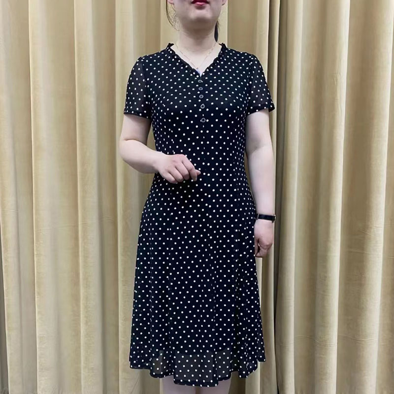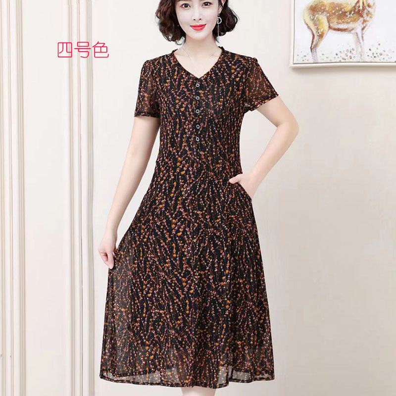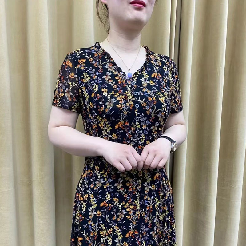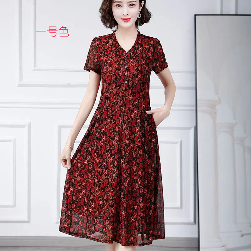 50歲媽媽夏裝短袖碎花連衣裙中老年女士大碼收腰中長款臺灣紗裙子