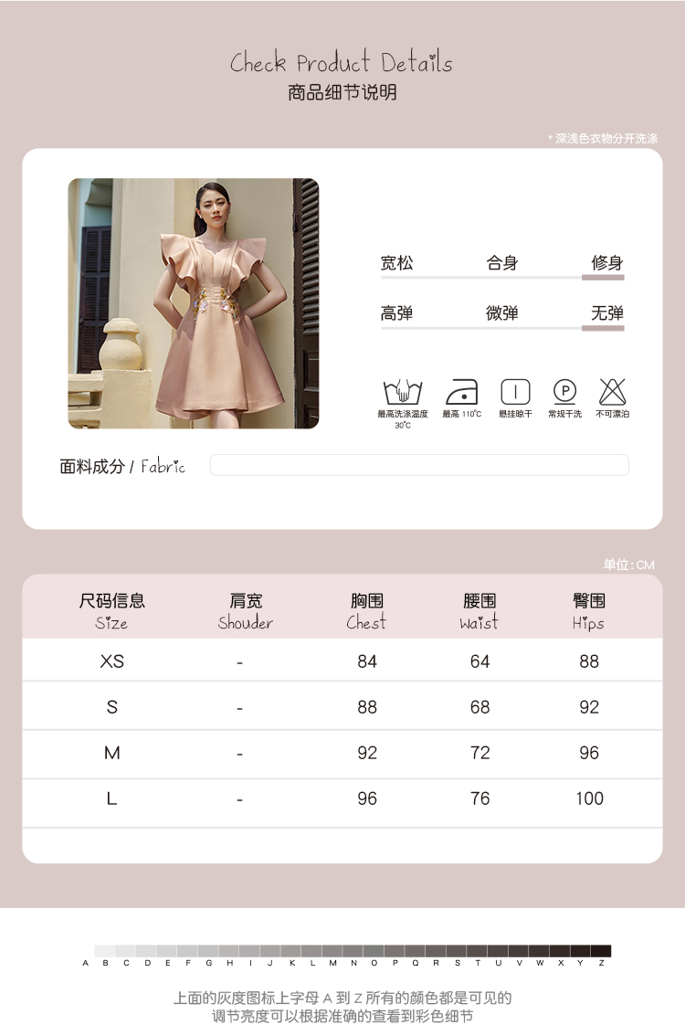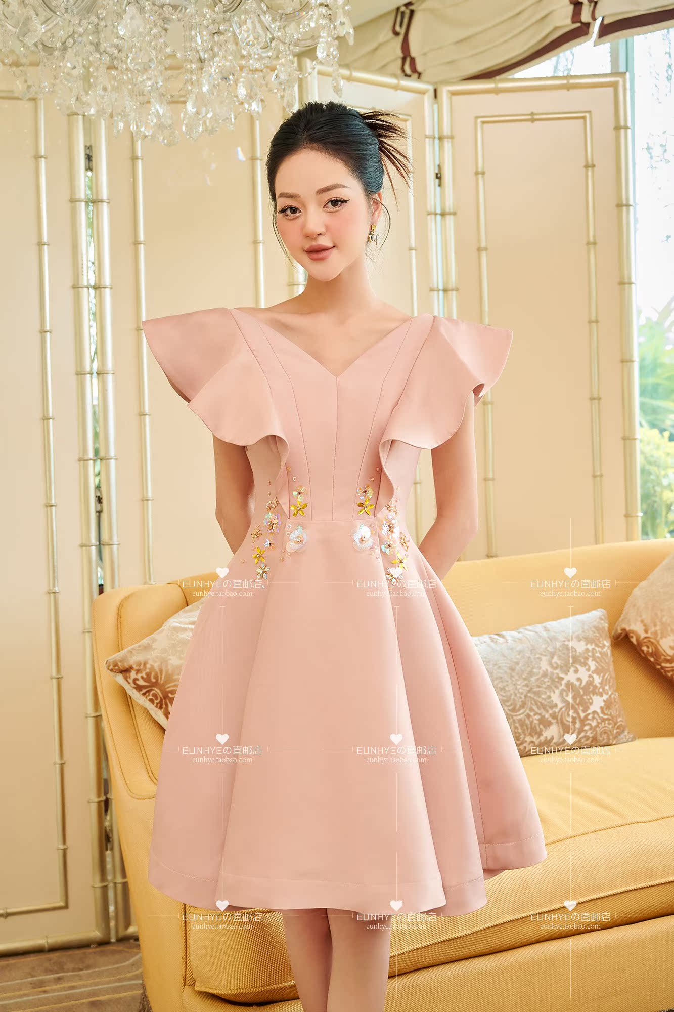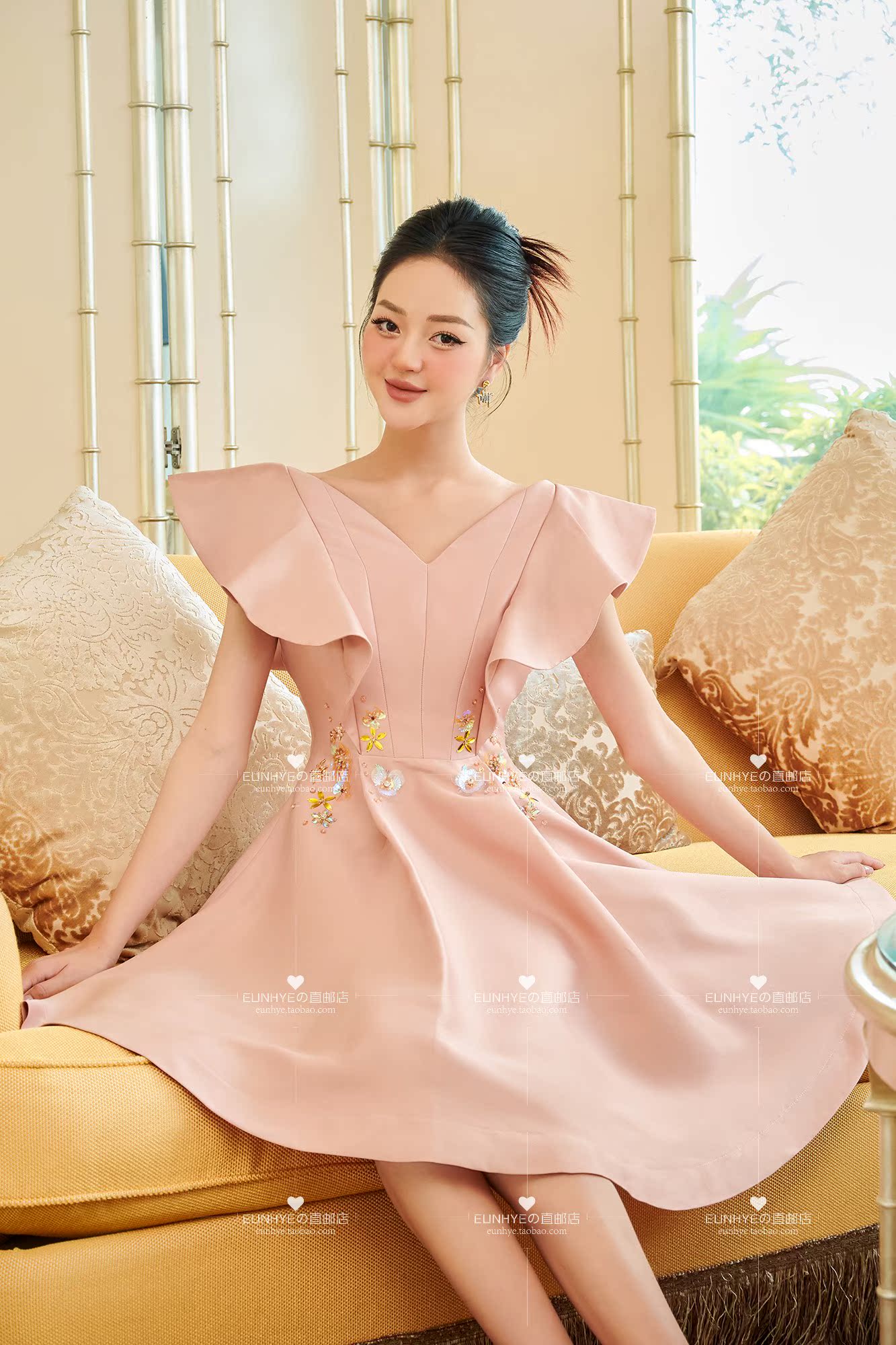 越南小眾ALLURIE2022年夏季新款荷葉邊飛飛袖鑲鉆純色公主裙甜美
