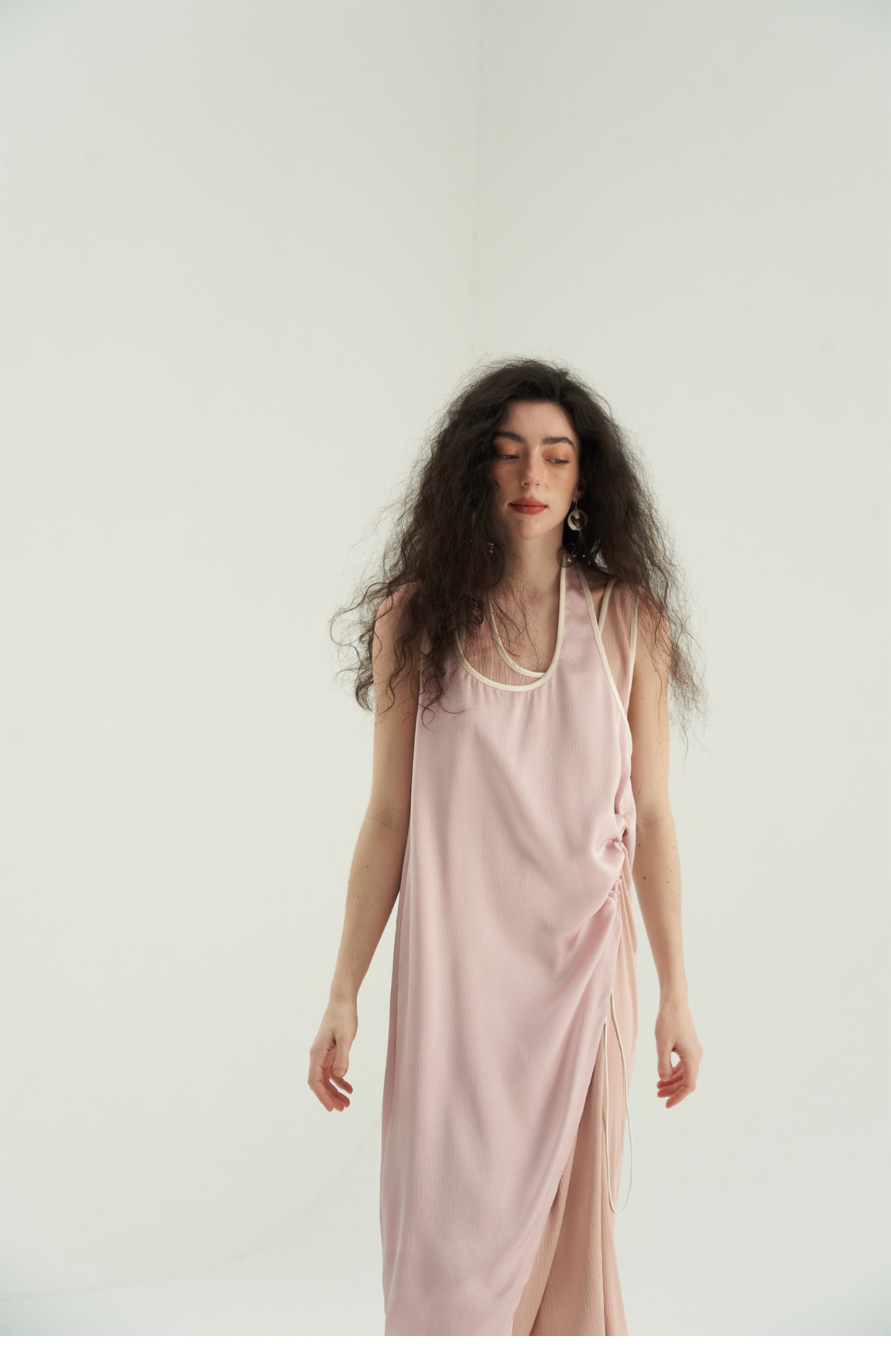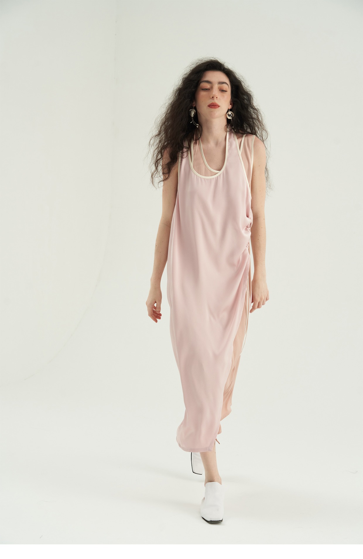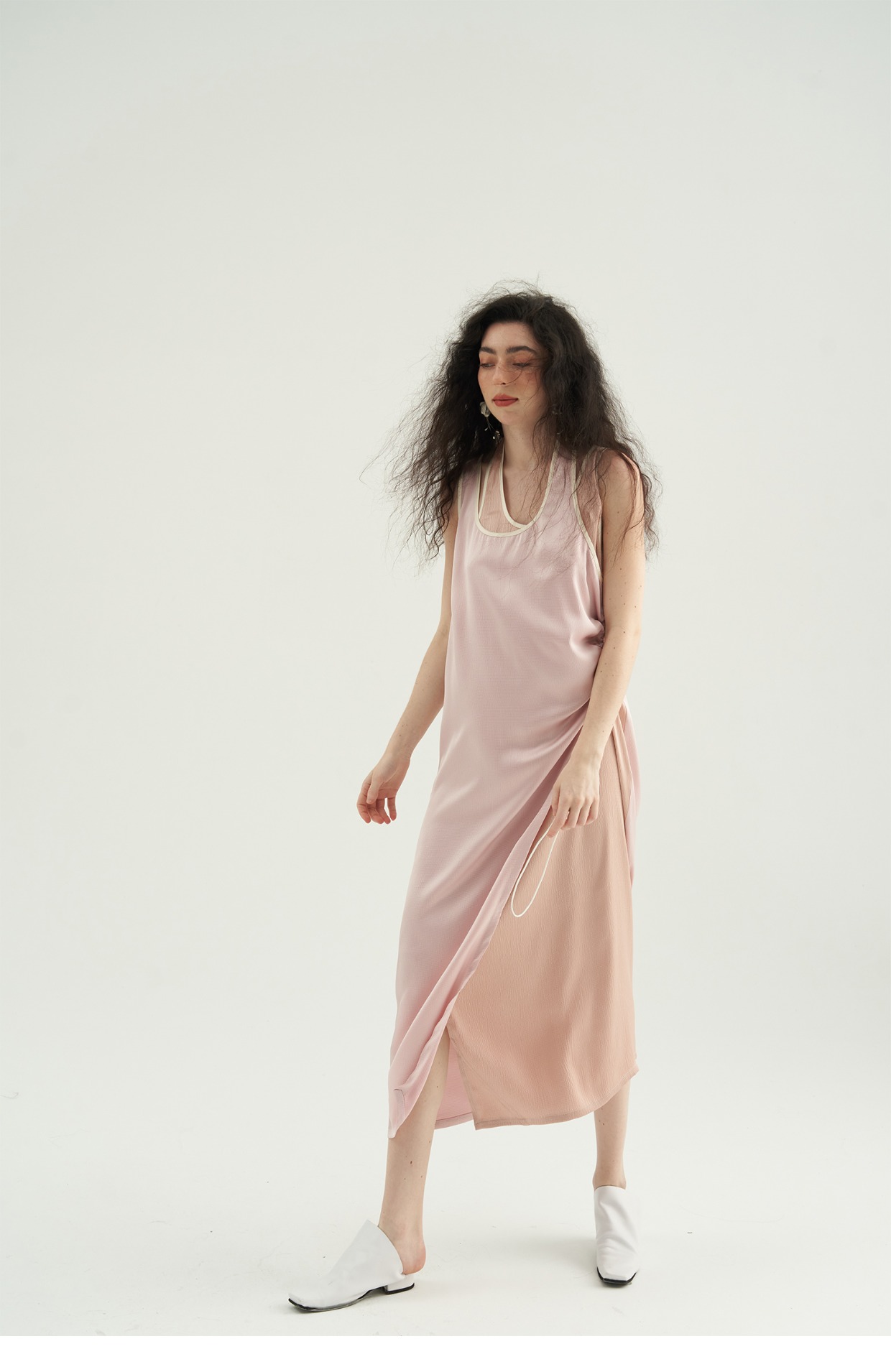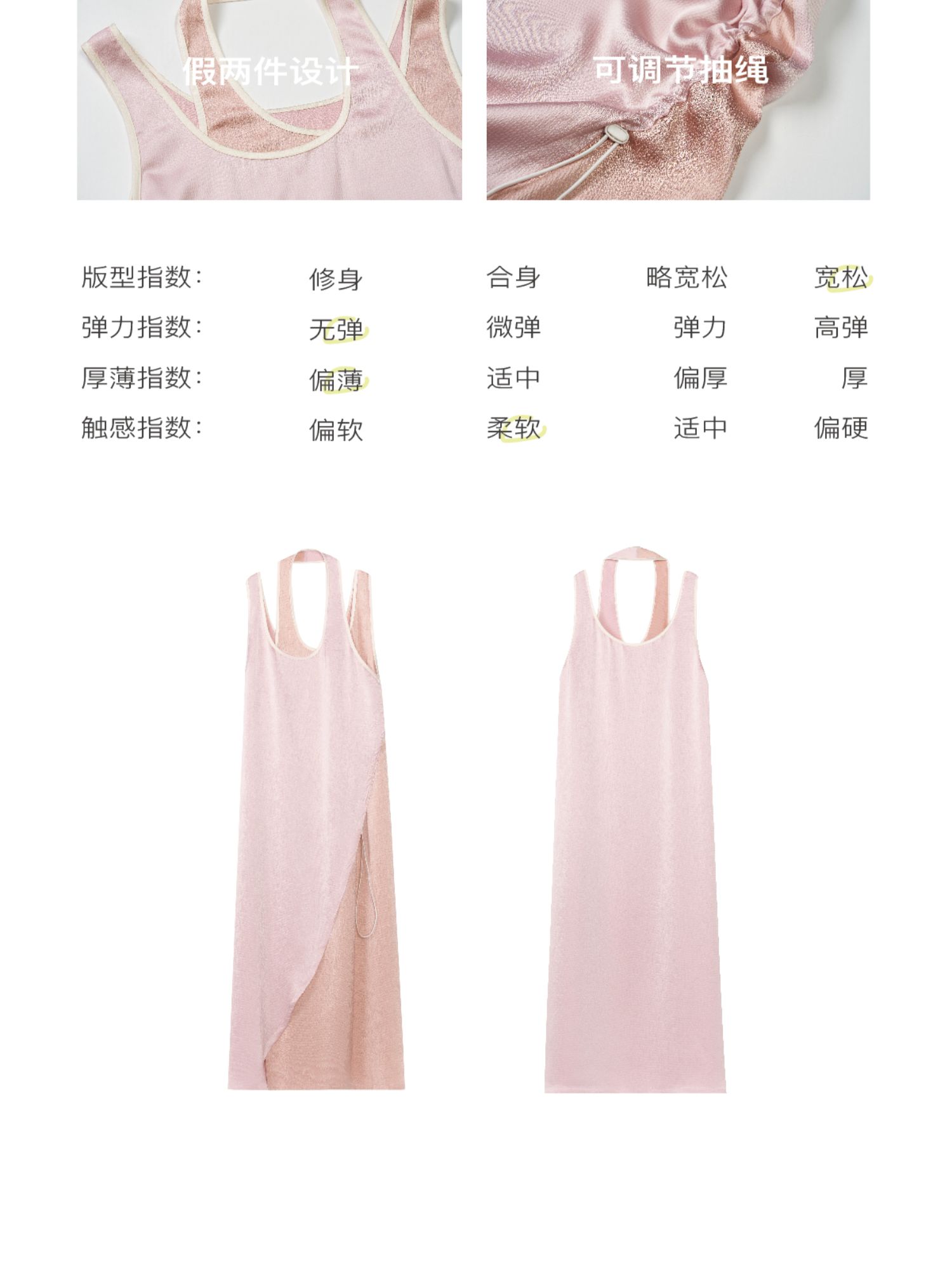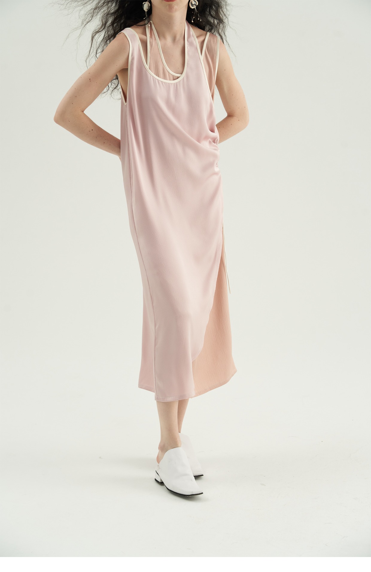 TiaTia現貨/煙粉假兩件寬松抽繩掛脖背心連衣裙
