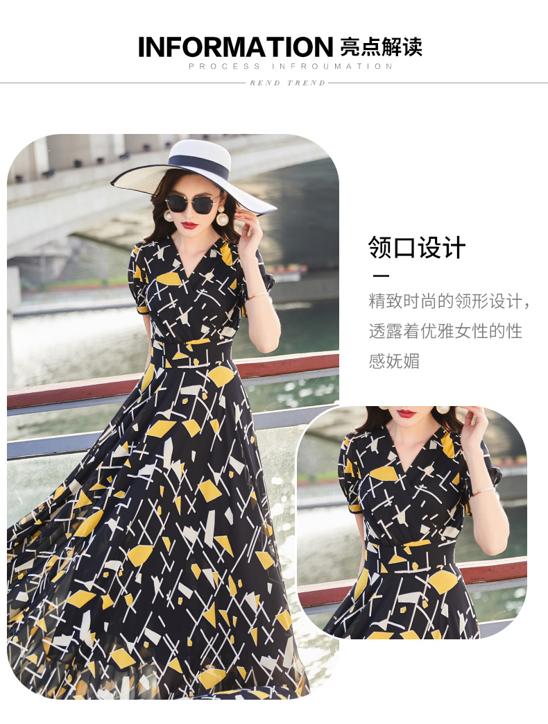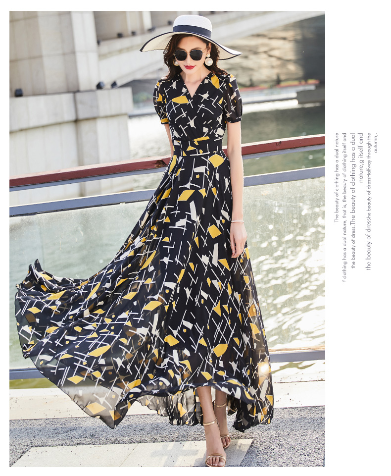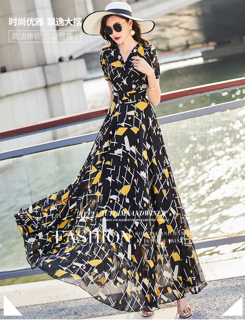 夏季雪紡黑色印花連衣裙女長款2022年新款時尚修身顯瘦大擺長裙子