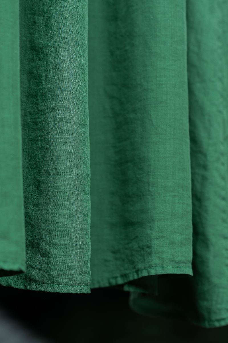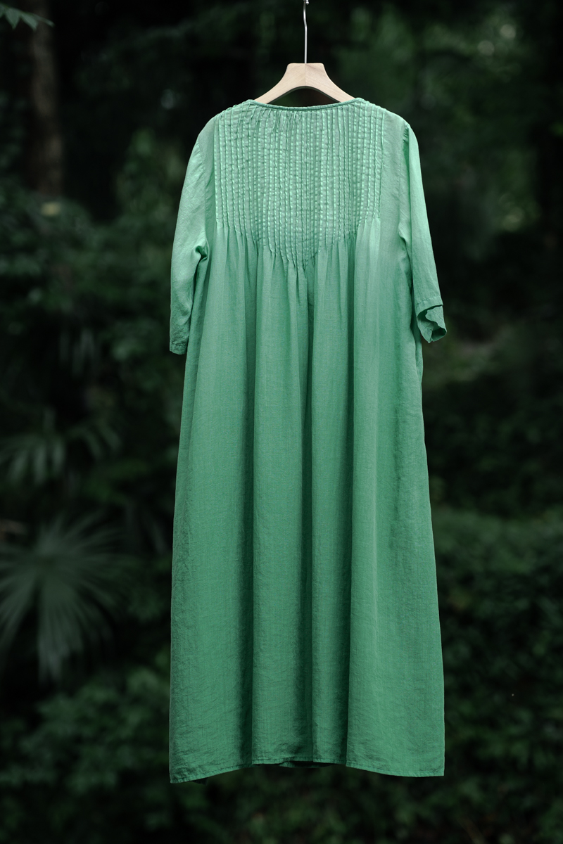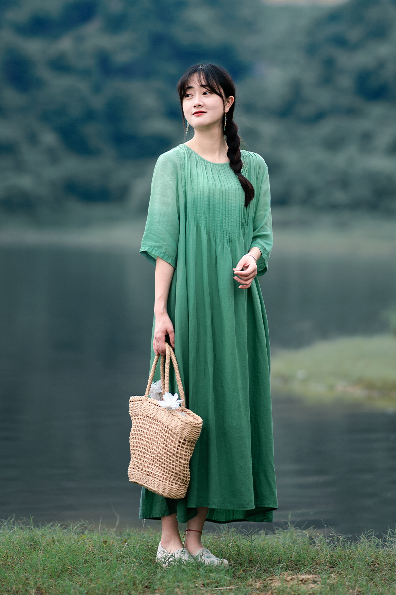 苧麻植物吊染綠色風琴褶寬松加長連衣裙 夏季設計感度假大碼長裙