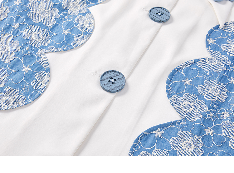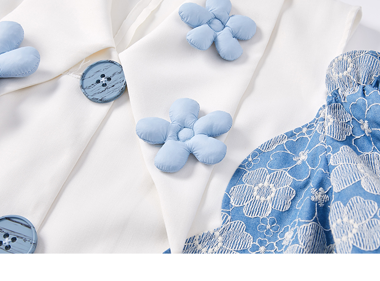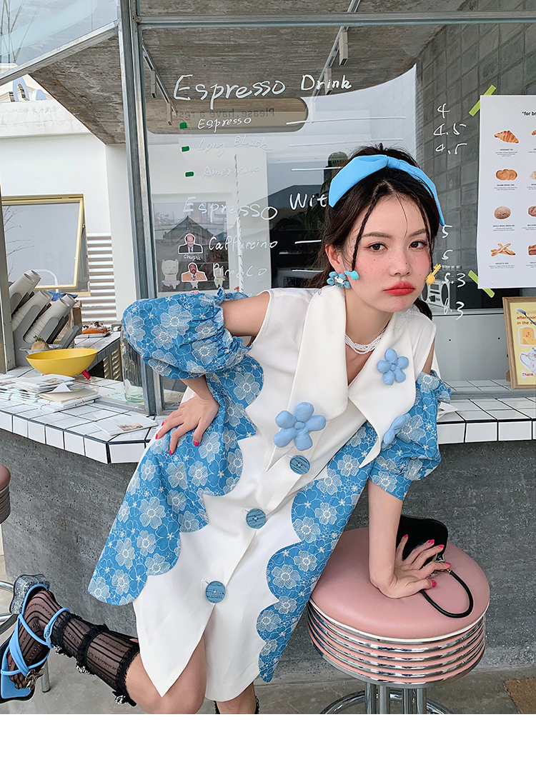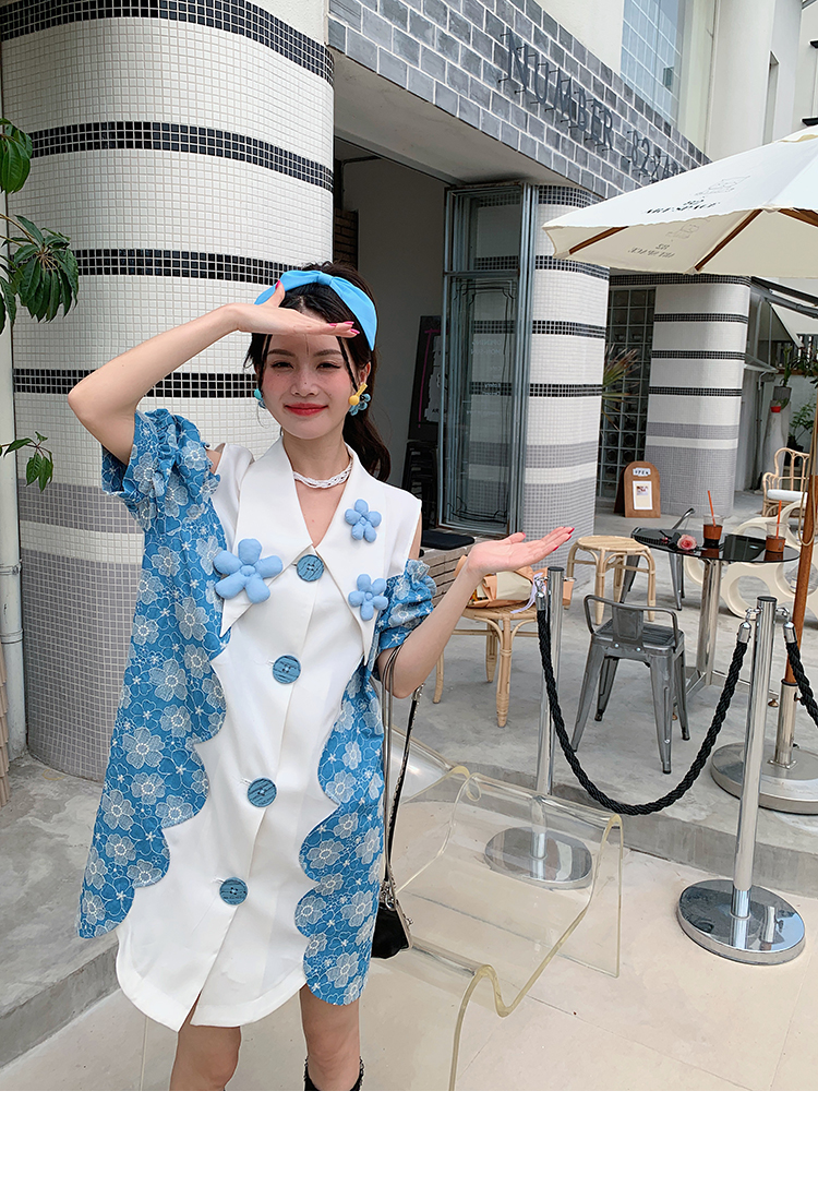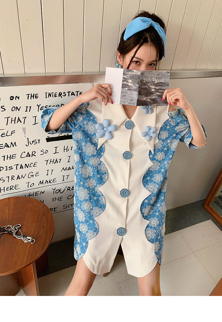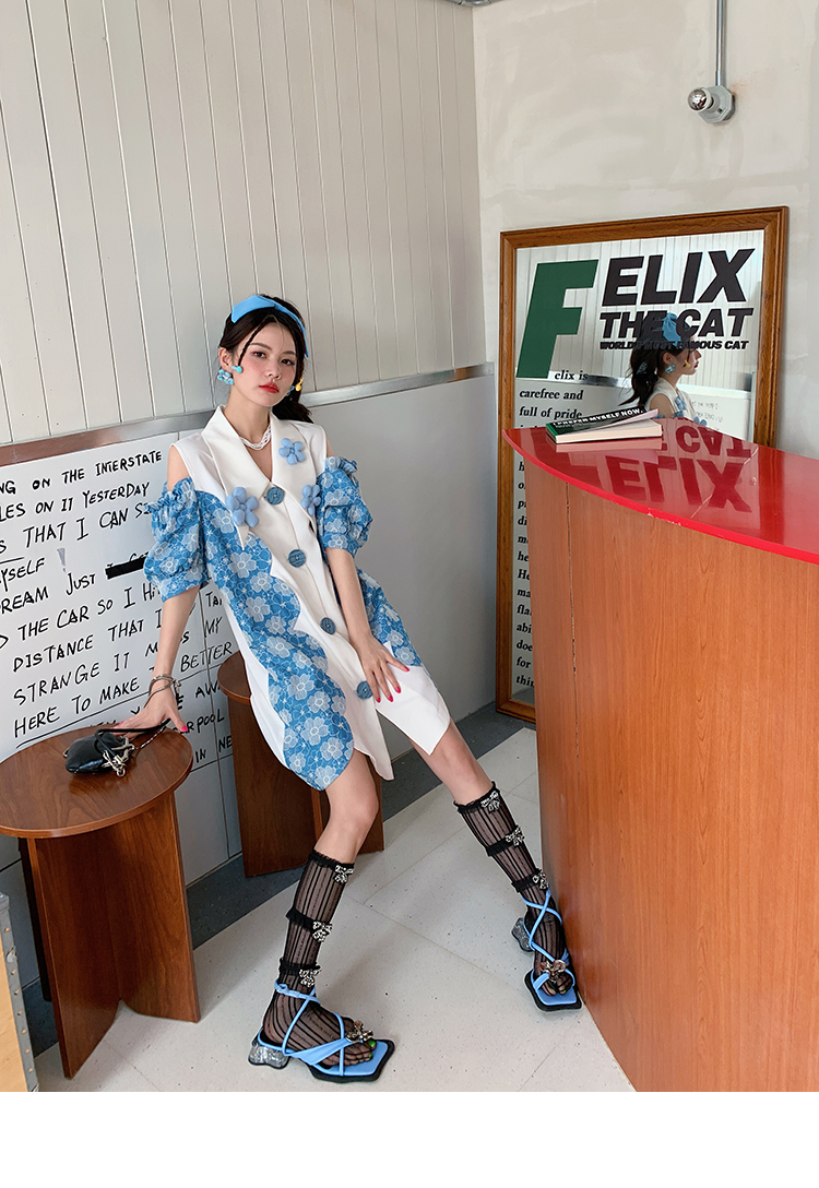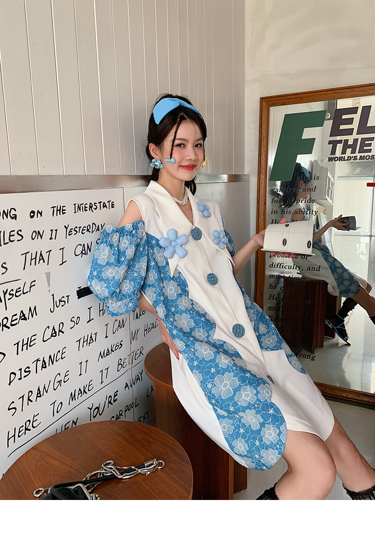 短袖直筒寬松露肩連衣裙2023夏季新款原創設計小眾藍色拼接連衣裙