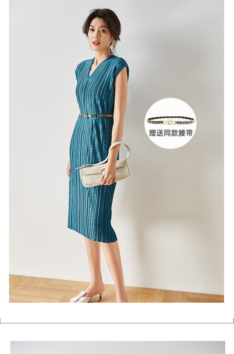 媽媽連衣裙v領收腰顯瘦a型百褶裙