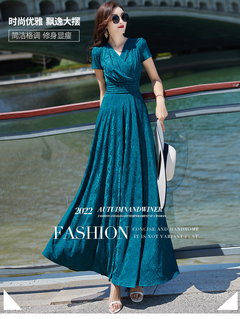 氣質V領精致提花高級感連衣裙長裙2023夏季新款顯瘦大擺長裙
