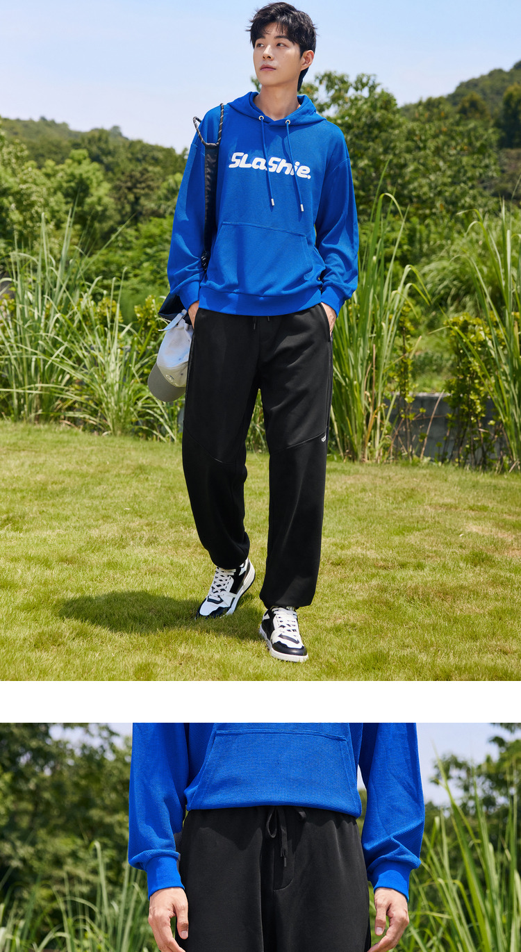 班尼路重磅華夫格褲子男秋季束腳休閑長褲灰色運動褲松緊腰衛褲