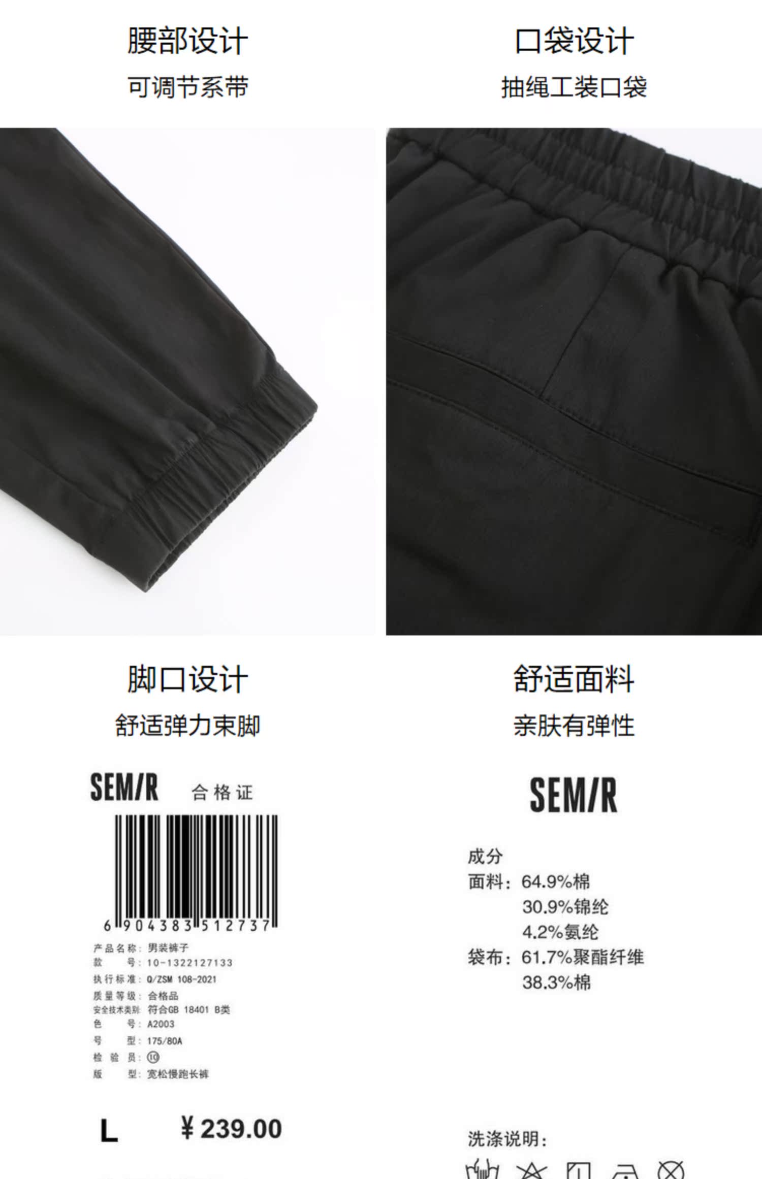 森馬休閑褲男2023秋季新款男士黑色明線工裝寬松褲子純棉束腳長褲