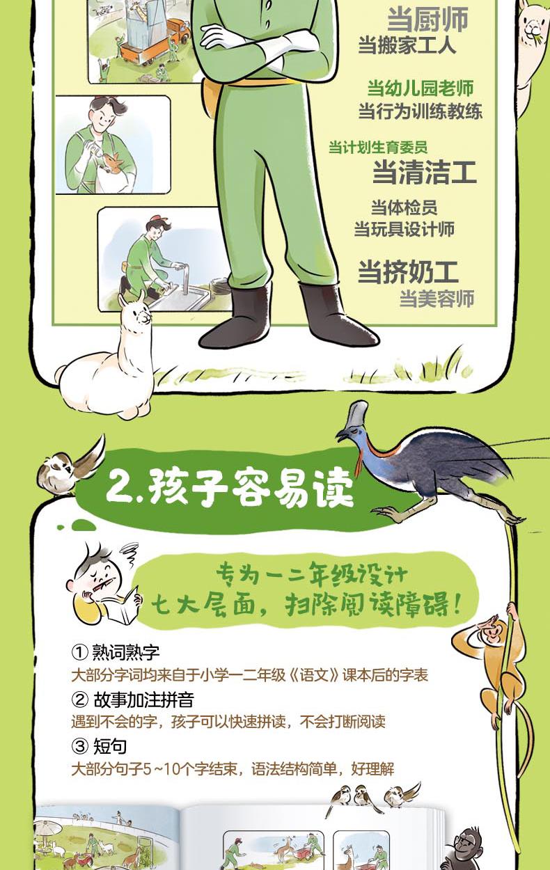 是一本少兒文學讀物,加注拼音。本冊圖書以飼養員的視角,用輕松、幽默的口吻向孩子講述了飼養員和動物之間有趣的故事,同時還以飼養員獨特的觀察與經驗講述了40種動物的特點,讓孩子在輕松幽默的閱讀氛圍中了解動物、愛上動物,愛上閱讀。書中加注拼音、文字流暢,讓學齡前與低年級小朋友順利閱讀,減少獨立閱讀初期的障礙!字、詞、句符合5~8歲兒童閱讀能力與語言發展特點,培養自主閱讀興趣,讓孩子成功踏上獨立閱讀之路!