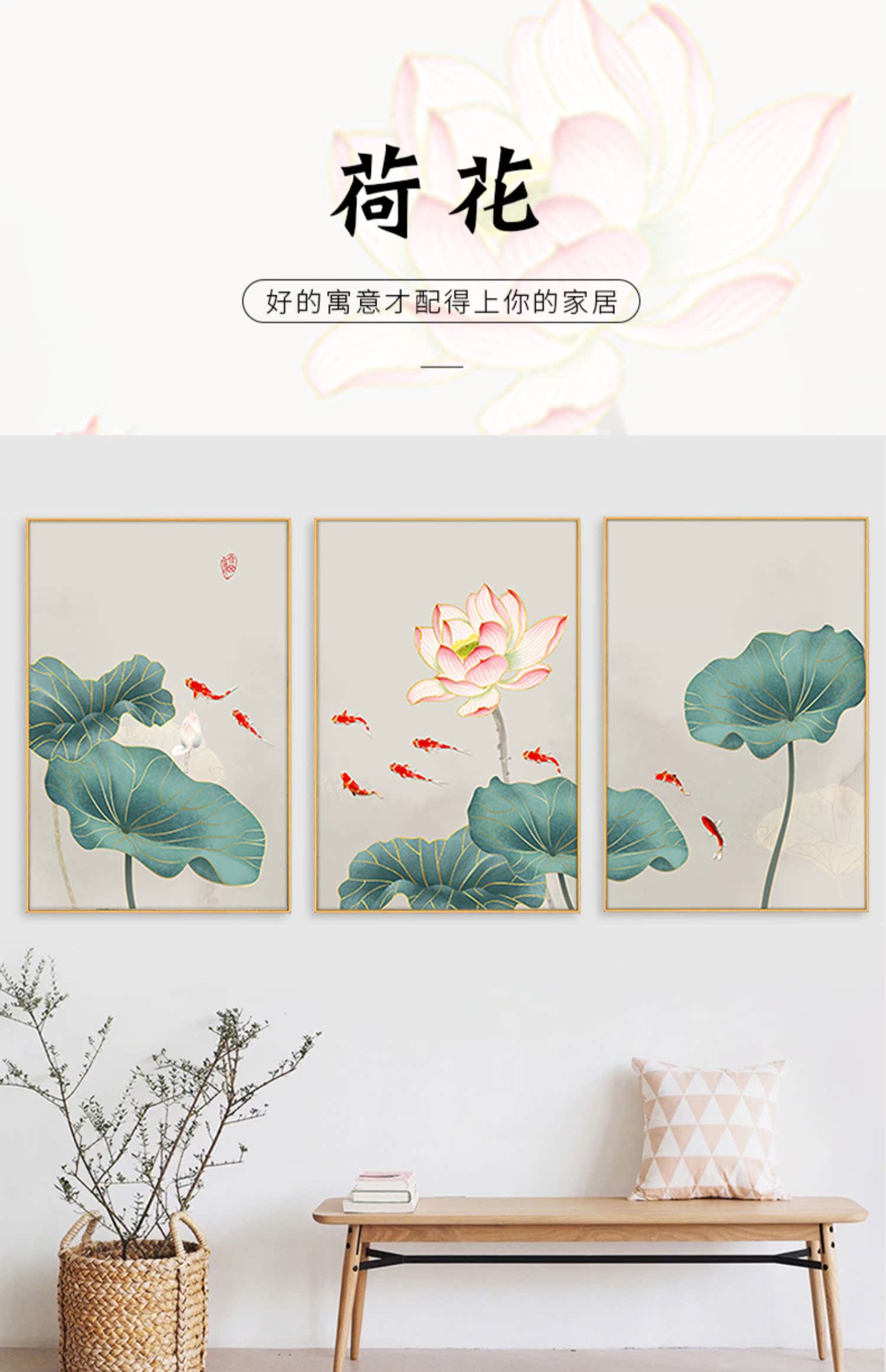 荷花十字繡2022新款三聯畫九魚圖中式線繡客廳大氣簡單2023自己繡
