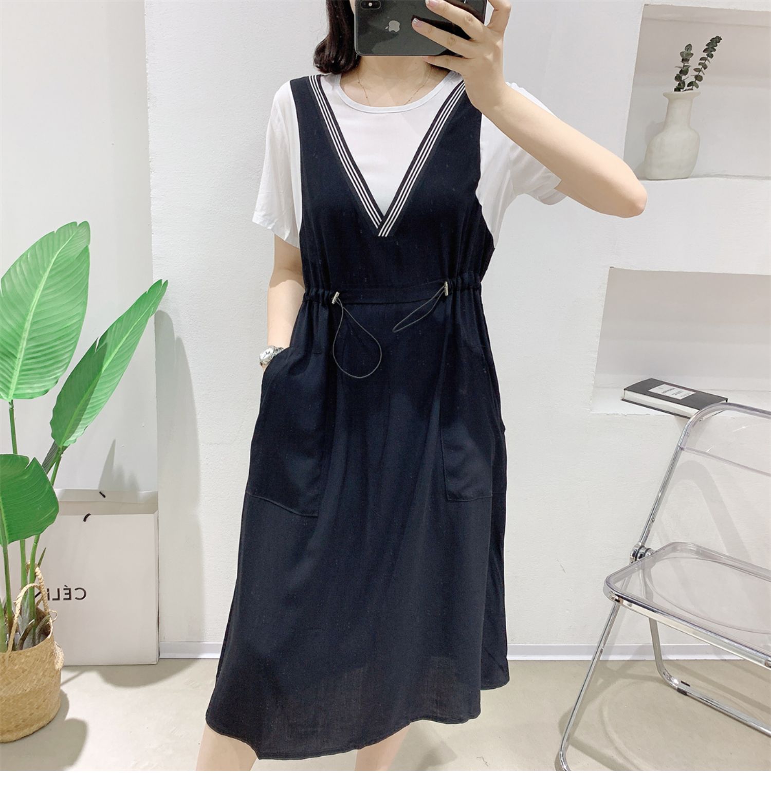 秋冬季大碼女裝黑咖搭配抽繩不規則上衣+氣質掛脖裙兩件套連衣裙