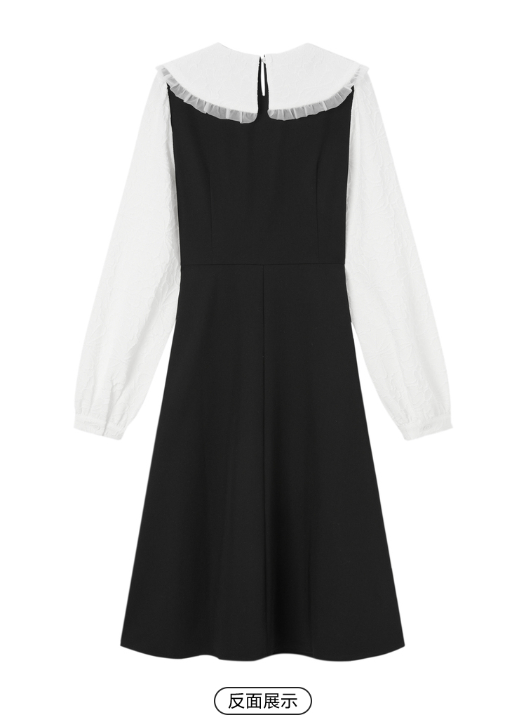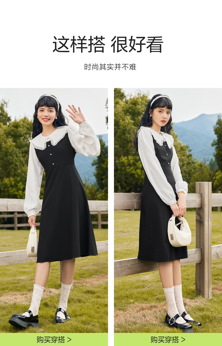 森馬連衣裙女2023秋季新款黑白拼接長袖小個子中長裙溫柔黑色裙子